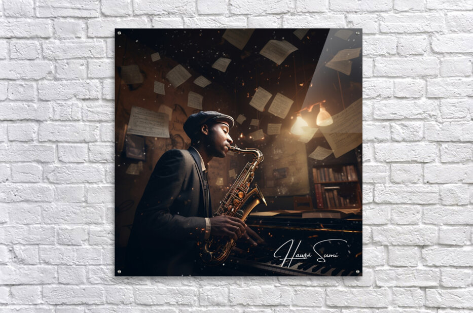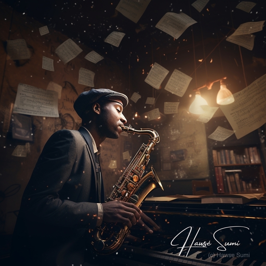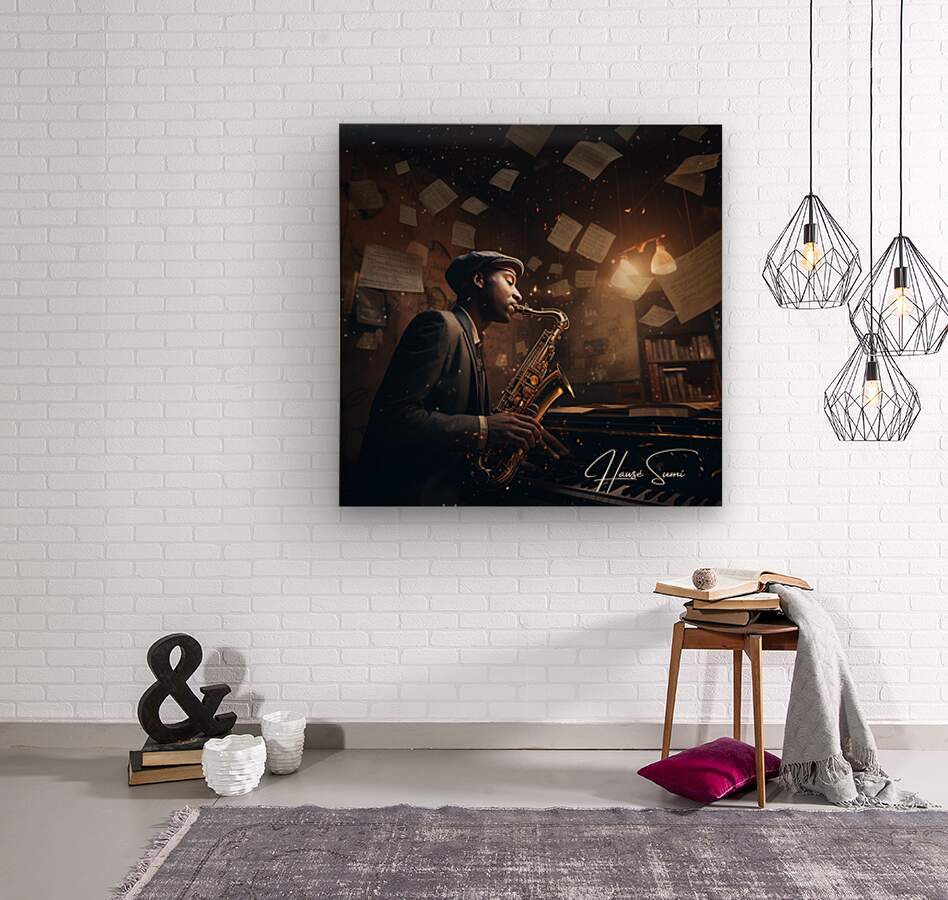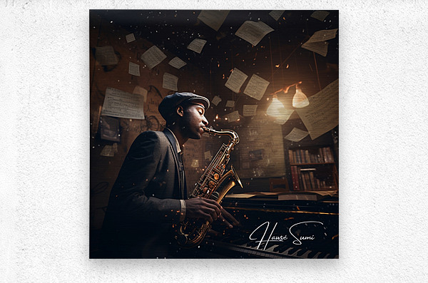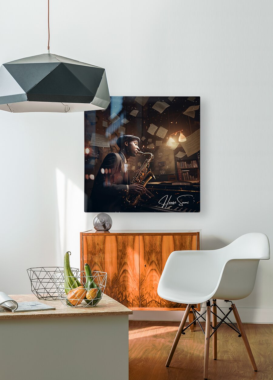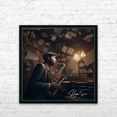 Under the soft glow of a desk lamp, amidst the rustic charm of his musical nook, this artist rehearses a jazz piece, his saxophone gleaming as brightl...[+]