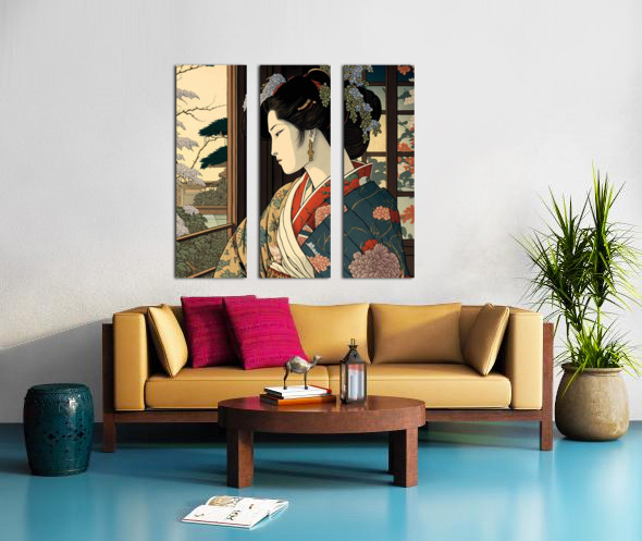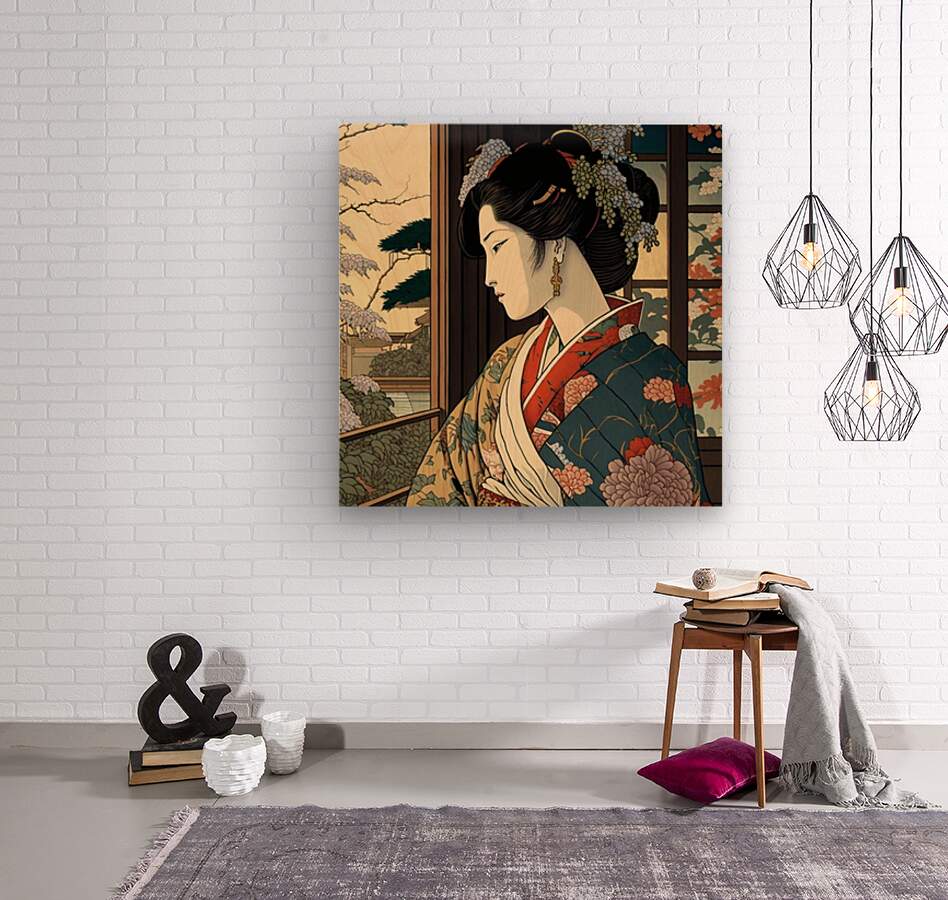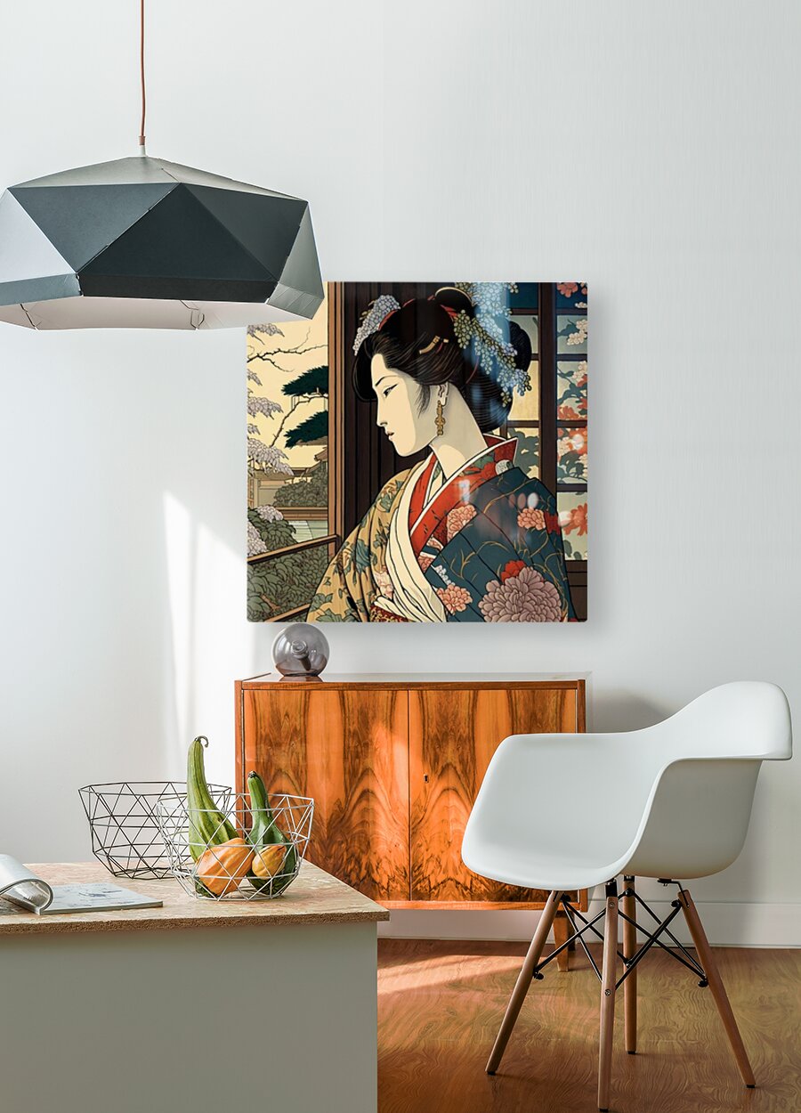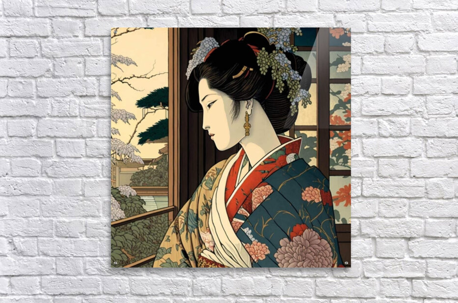 "Wistful Blossoms" portrays a young woman in an intricately designed kimono, gazing thoughtfully out of a window. The surrounding cherry blossoms and traditional Japanese architecture enhance the serene and reflective atmosphere, celebrating the harmony between nature and culture.