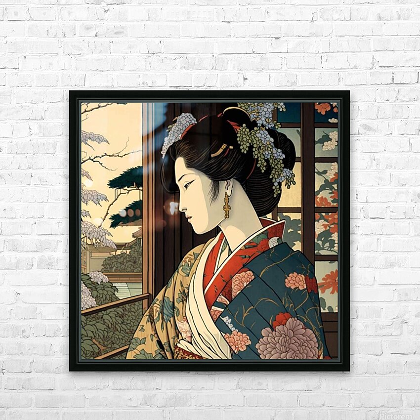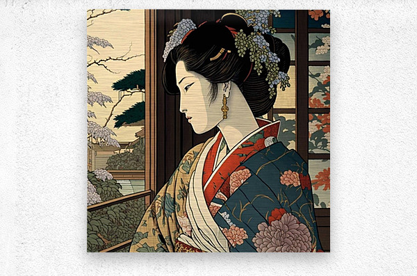 "Wistful Blossoms" portrays a young woman in an intricately designed kimono, gazing thoughtfully out of a window. The surrounding cherry blossoms and ...[+]