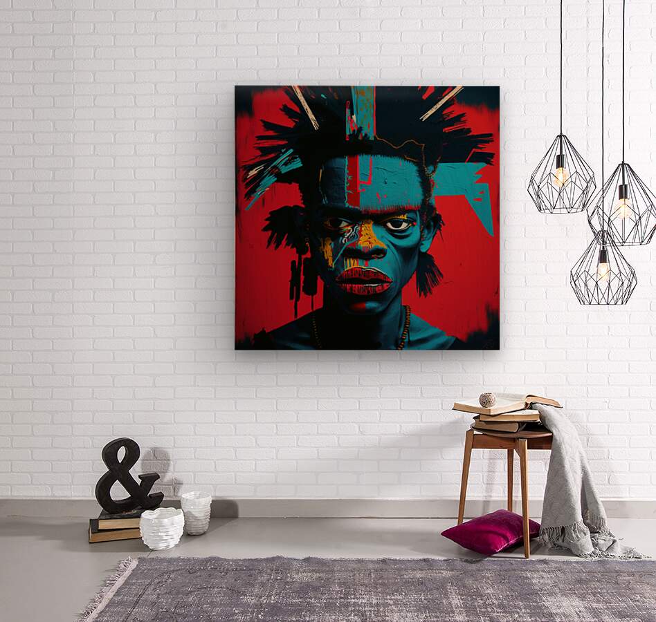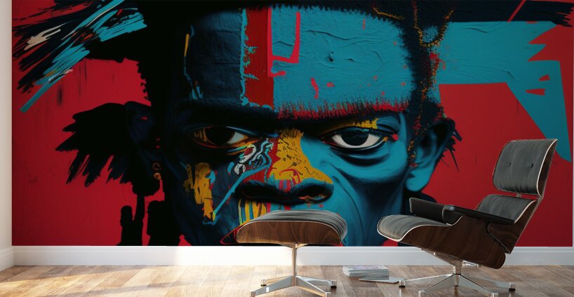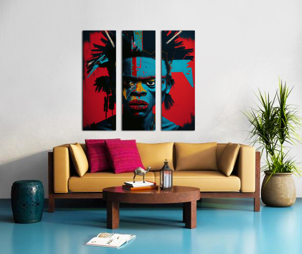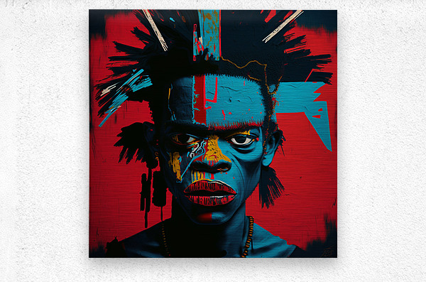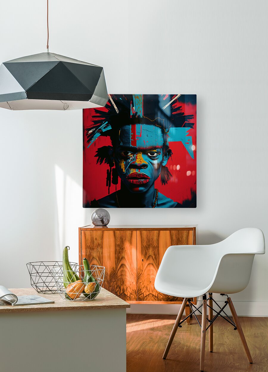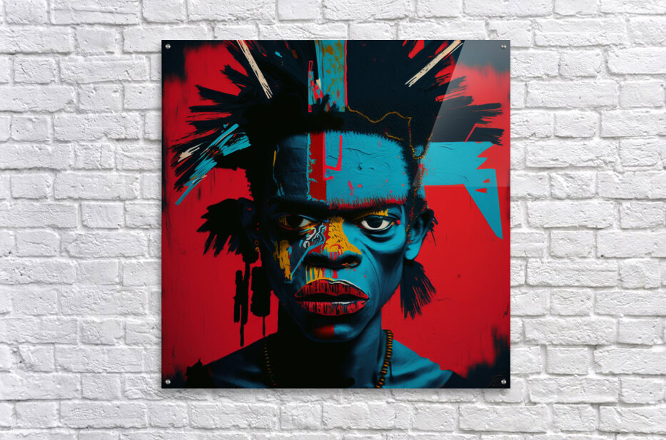 Urban Warrior, captures the intense gaze of a young man painted in vivid, contrasting colors. This striking portrait blends elements of street art and modern expressionism, emphasizing the raw, unfiltered emotions of the subject. The bold use of red, blue, and yellow creates a powerful visual impact, symbolizing the strength and resilience found within urban environments. The detailed textures and abstract patterns highlight the inner turmoil and fierce determination of the modern urban warrior.