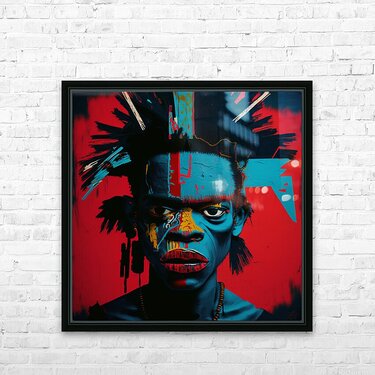 Urban Warrior, captures the intense gaze of a young man painted in vivid, contrasting colors. This striking portrait blends elements of street art and...[+]