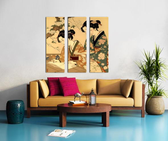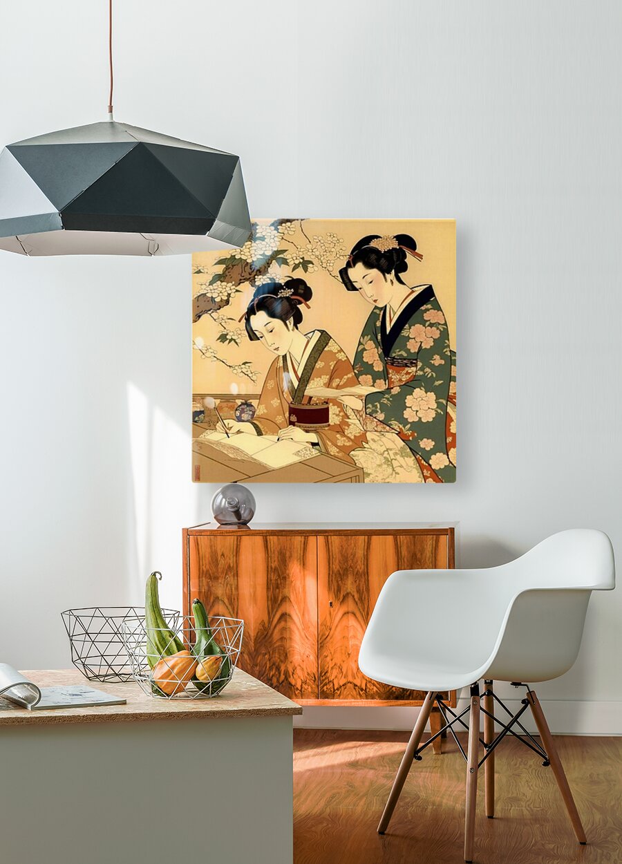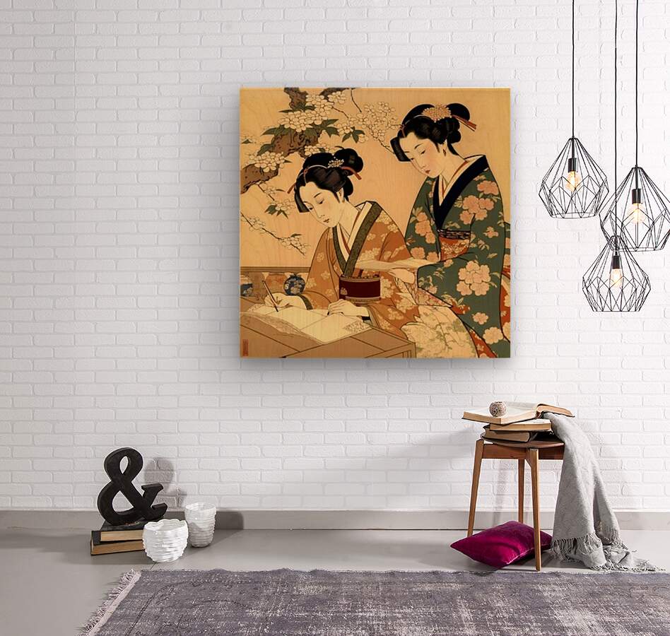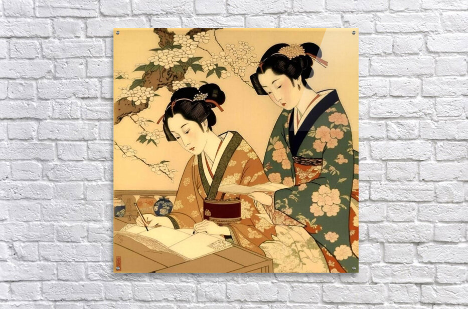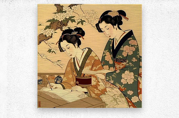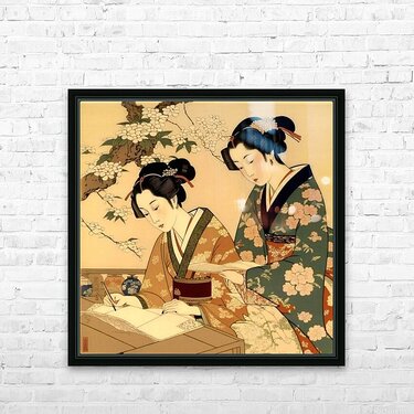 "Sakura Scholars" illustrates two women in beautiful kimonos, deeply engrossed in writing under a cherry blossom tree. The detailed patterns and harmonious composition highlight the importance of knowledge and tradition in Japanese culture, creating a scene of intellectual and natural beauty.