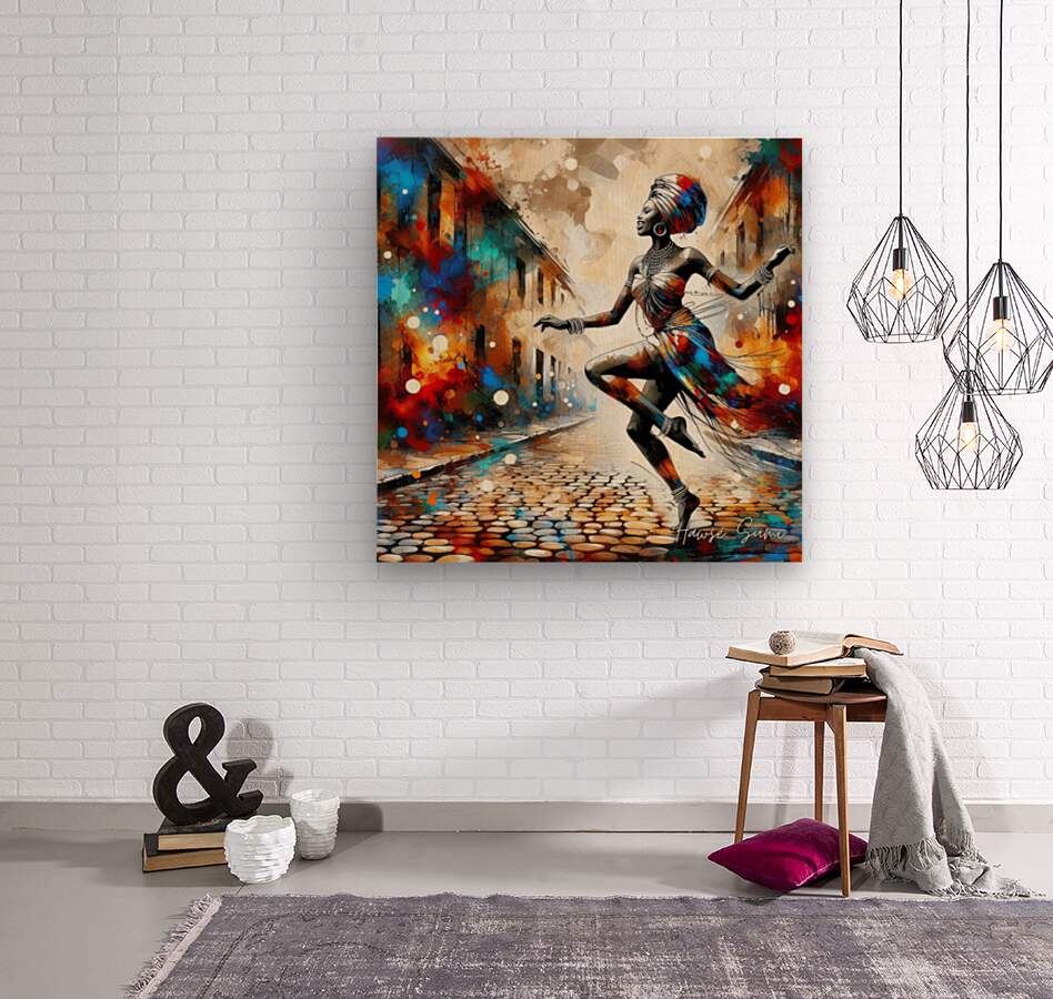 "Joyful Steps" captures a moment of pure exuberance as a woman dances freely in a vibrant, colorful street. Her elegant attire and radiant smile reflect the rich cultural heritage and joyful spirit of Africa. This piece symbolizes freedom, celebration, and the beauty of African traditions.