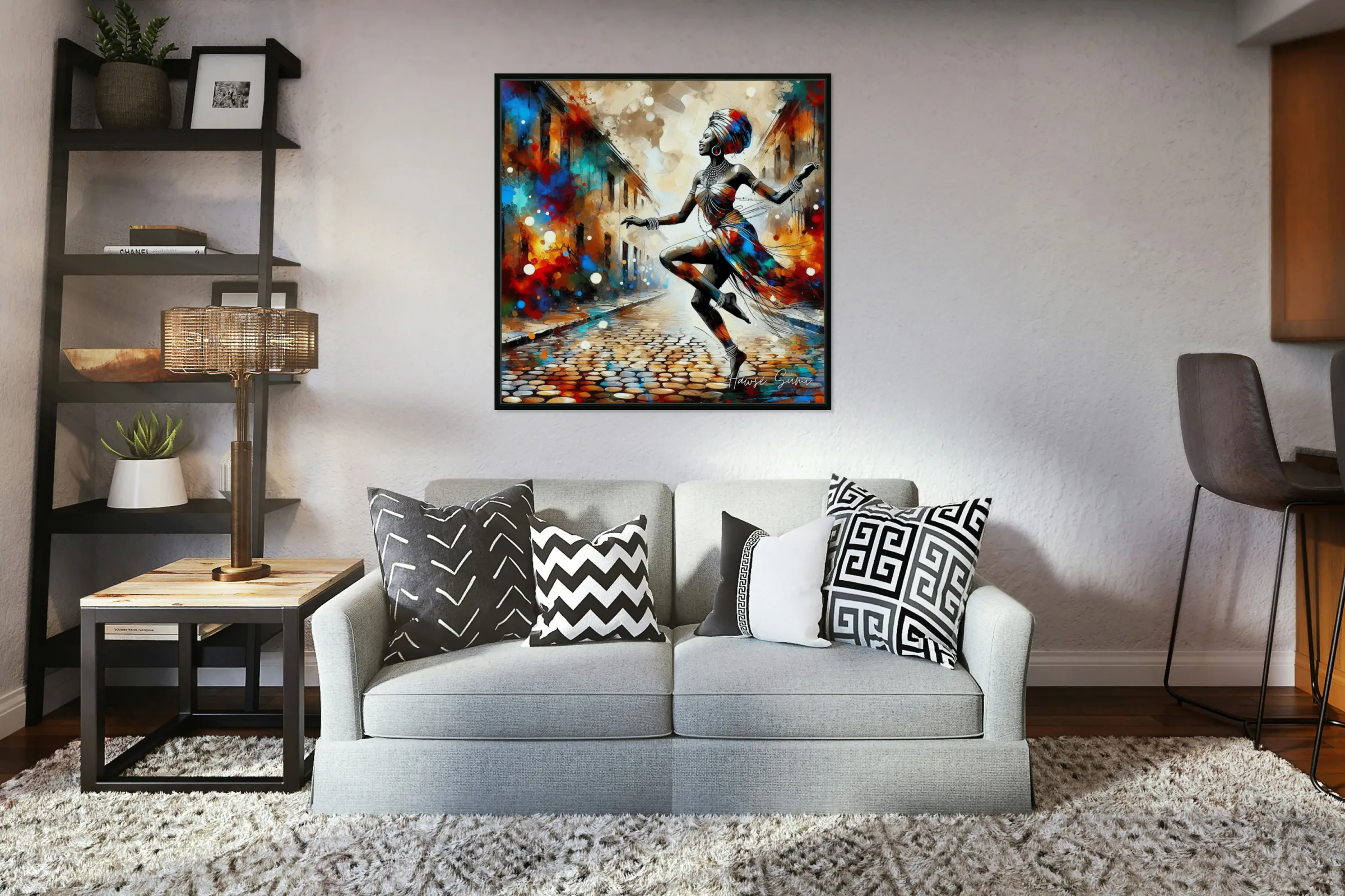 "Joyful Steps" captures a moment of pure exuberance as a woman dances freely in a vibrant, colorful street. Her elegant attire and radiant smile reflect the rich cultural heritage and joyful spirit of Africa. This piece symbolizes freedom, celebration, and the beauty of African traditions.