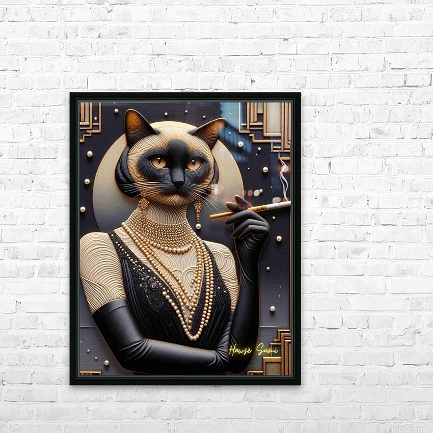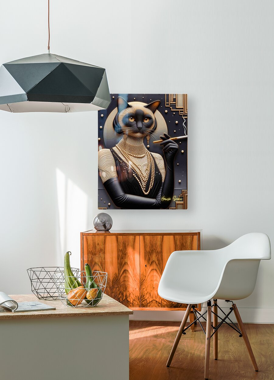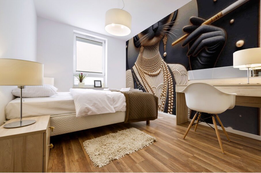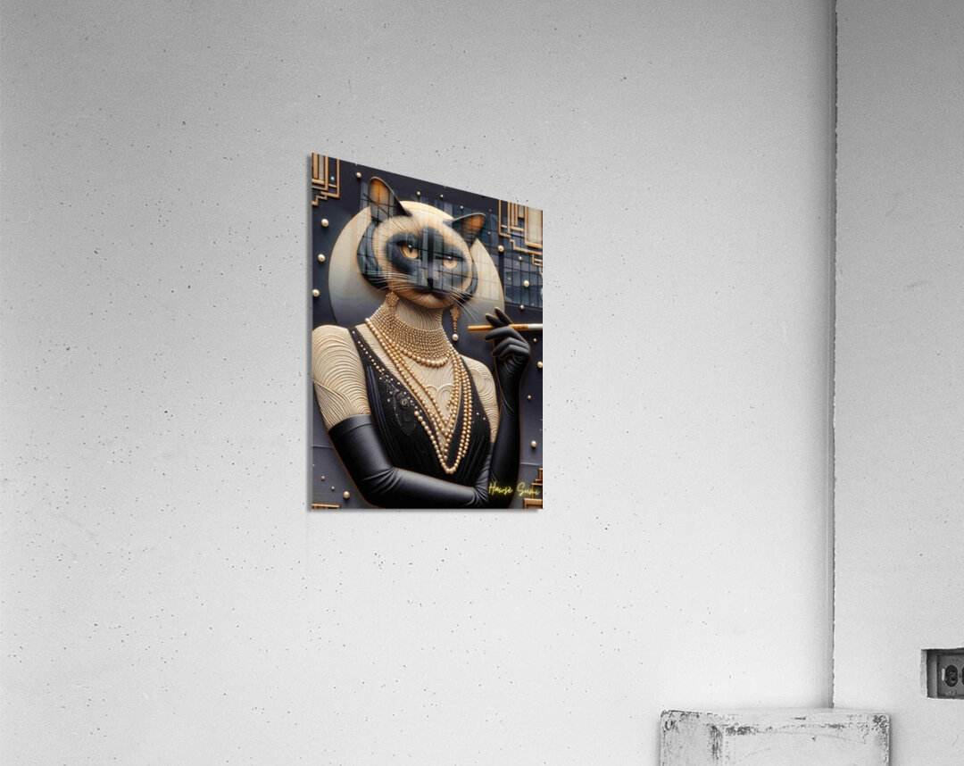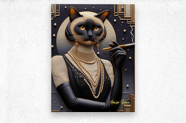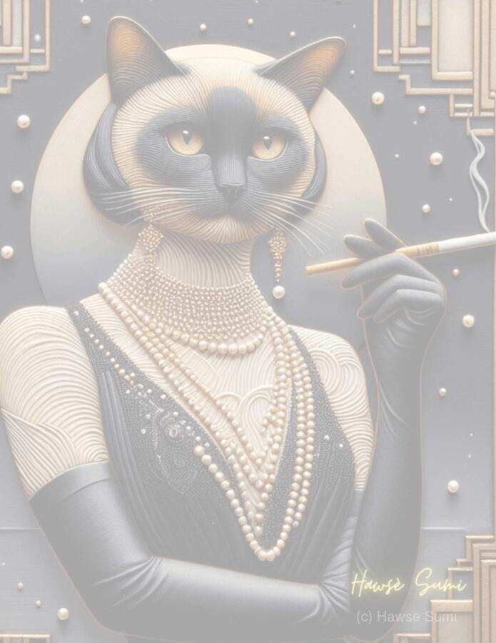 In the heart of the Roaring Twenties, within the smoky ambience of Paris’s most clandestine jazz lounge, there prowled a figure as enigmatic as the era itself – Mademoiselle Mystique. Cloaked in the night’s embrace with pearls and whispers of scandal adorning her neck, this feline femme fatale commanded the silent awe of the city's elite. With eyes reflecting the moon’s secrets and a demeanor as smooth as the velvet gloves she donned, she was the muse behind every artist’s frenzy and the silent keeper of their darkest confessions. Each night, beneath the Art Deco arches, she spun a web of intrigue so delicate that to speak of it would shatter the illusion. Here she sits, the epitome of the era's untamed elegance, a testament to the allure that felines and femmes alike have wielded throughout the threads of time.