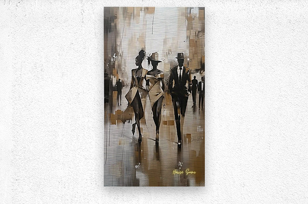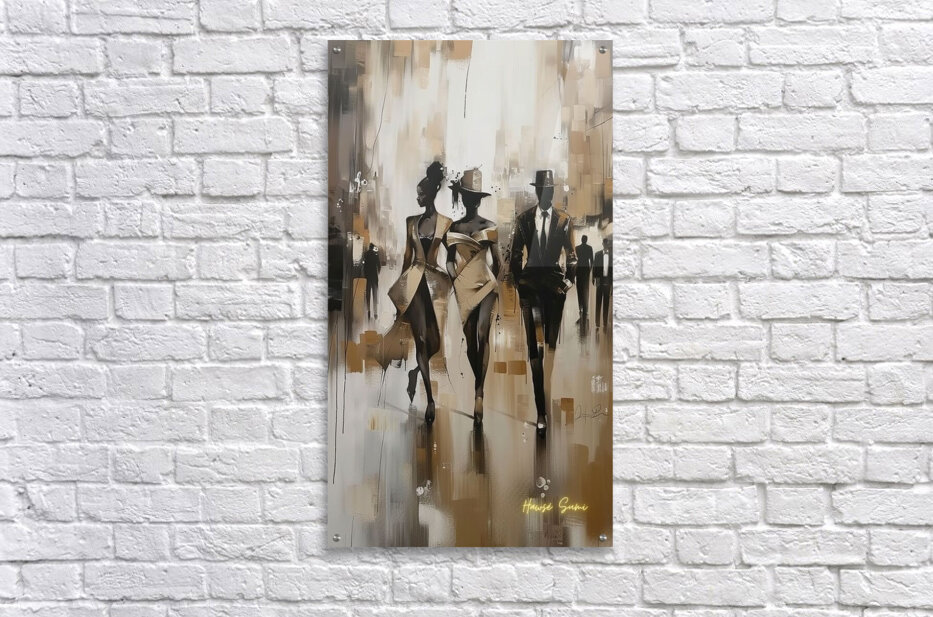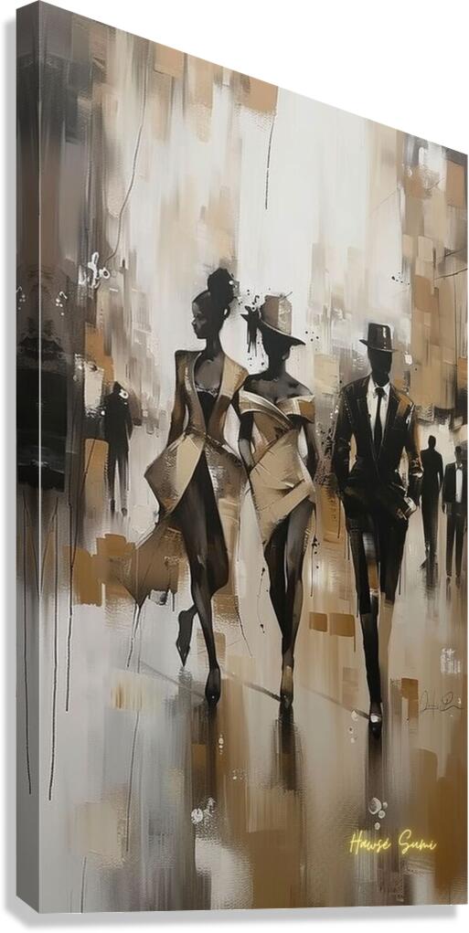 Amidst the blurred outlines of a busy city street, three figures stride forward with purpose. Their coordinated attire and confident postures suggest a unity of vision and strength. They move through the city as one, a powerful triad that commands attention. Each figure represents a pillar of strength, elegance, and ambition, reflecting the synergy of their combined presence.