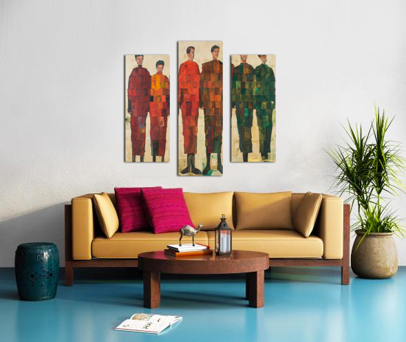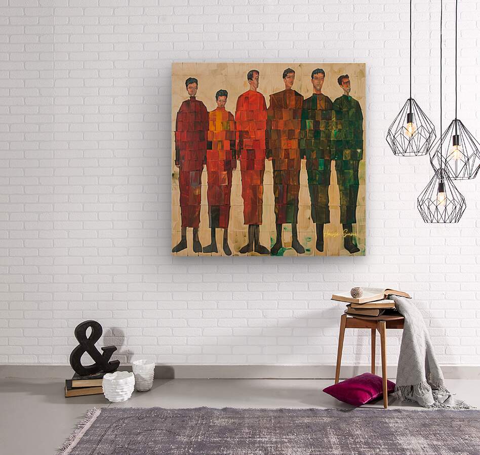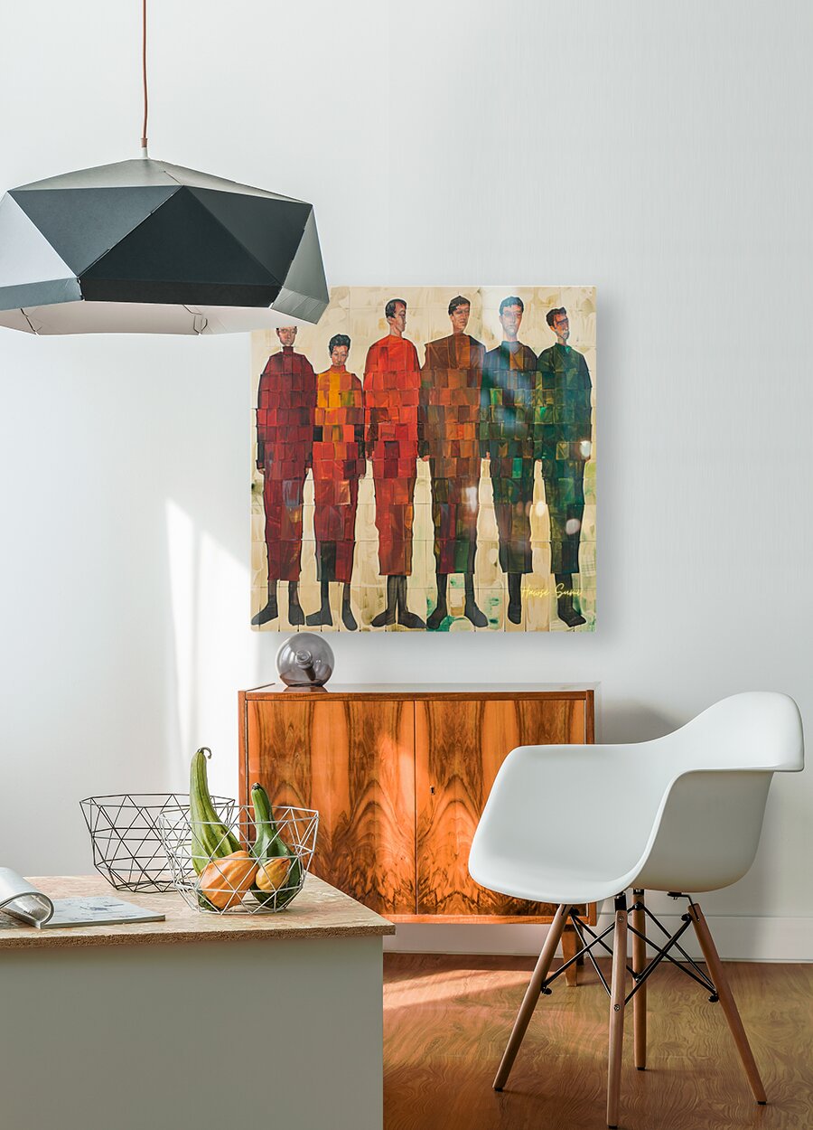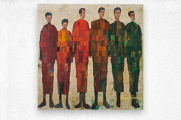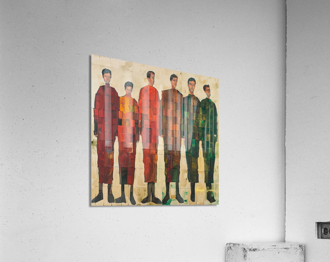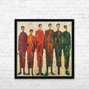 A group of figures stands together, each unique yet harmoniously integrated into the composition. The geometric patterns and varying shades symbolize ...[+]