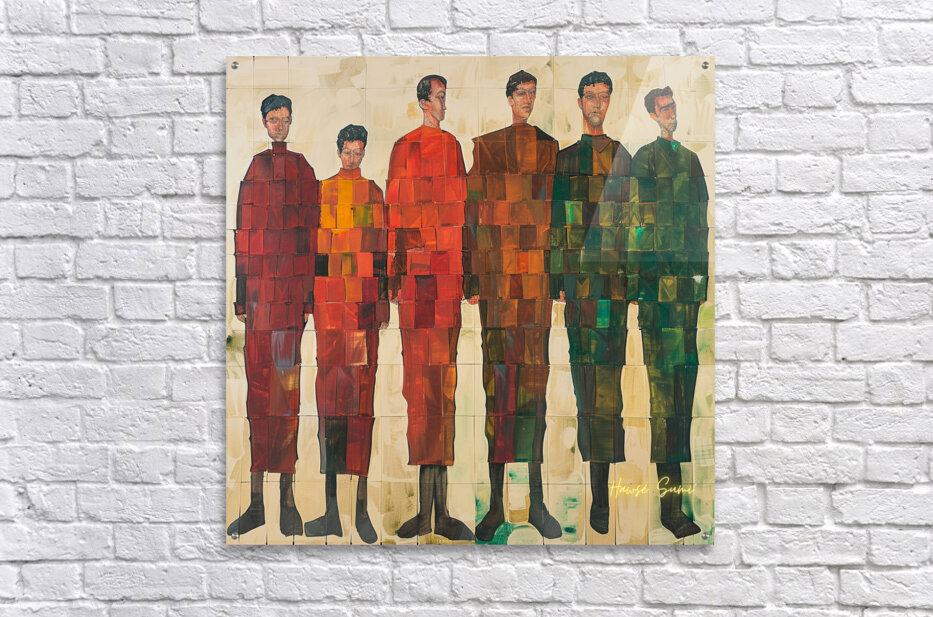 A group of figures stands together, each unique yet harmoniously integrated into the composition. The geometric patterns and varying shades symbolize the diversity and unity within human connections. This artwork highlights the strength found in collective diversity and the beauty of individual differences coming together to form a cohesive whole.