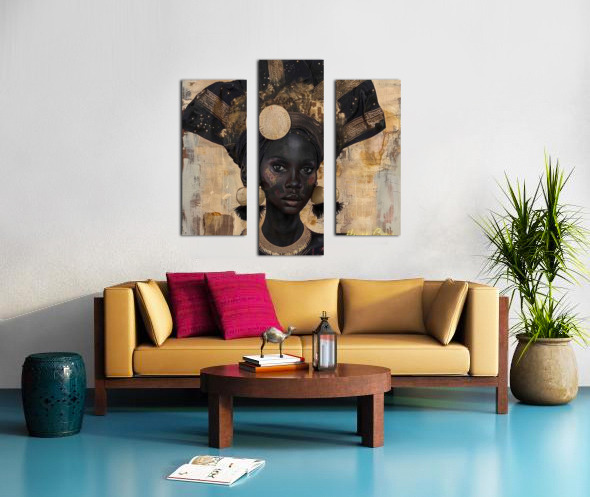 Empress of the Elements, a woman whose aura is a tapestry of strength and elegance. Her eyes tell stories of a thousand lifetimes, and her regal bearing speaks of her command over earth, air, fire, and water. Adorned with golden earrings that symbolize her power and wisdom, she stands as a beacon of resilience. Her visage is a blend of vibrant colors and textures, representing the diverse and rich history she embodies.
