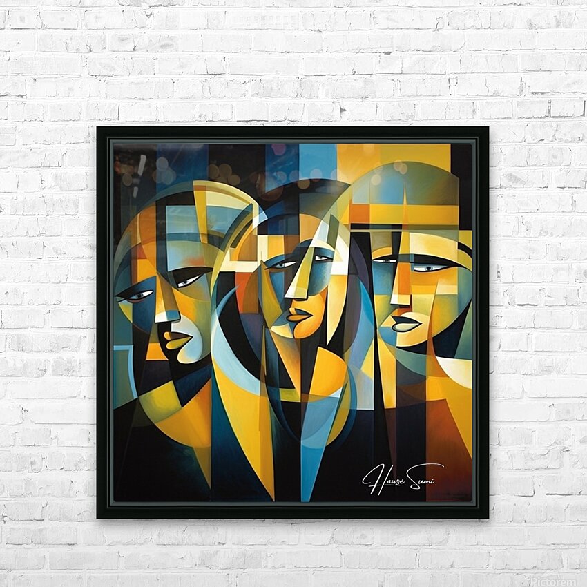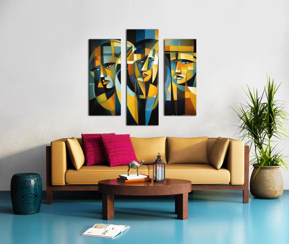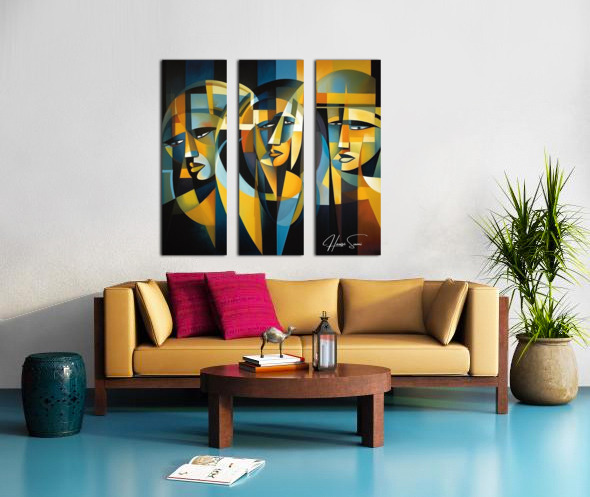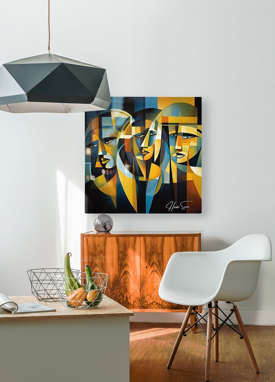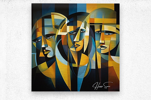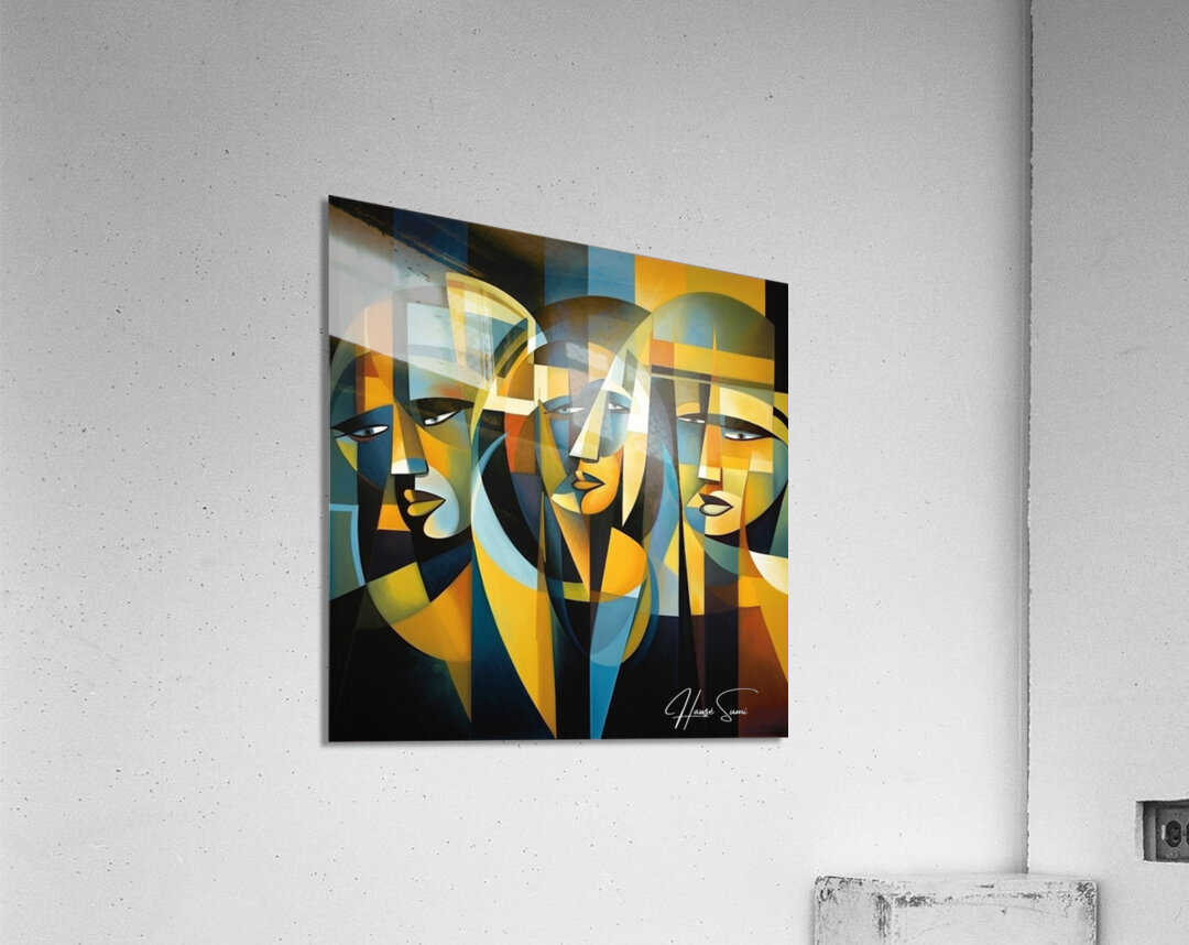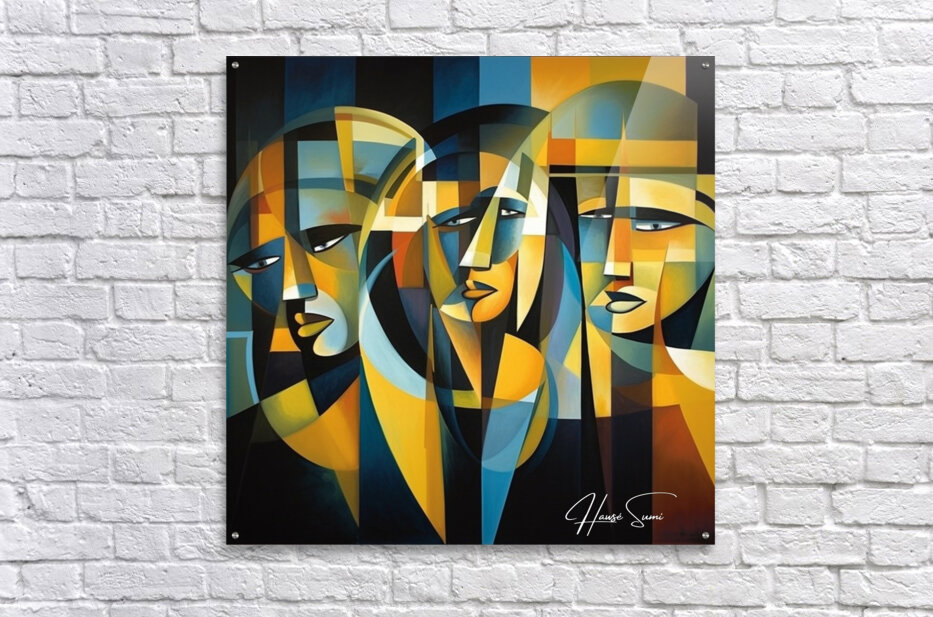 "Veil of Reflections" explores the enigmatic nature of self-perception and the layers that conceal our true identity. Through a mosaic of angular shapes and subdued tones, this piece reveals the multifaceted reflections that compose our self-image. The three figures, intertwined yet distinct, symbolize the different roles we play in life and the internal reflections that shape our understanding of who we are.