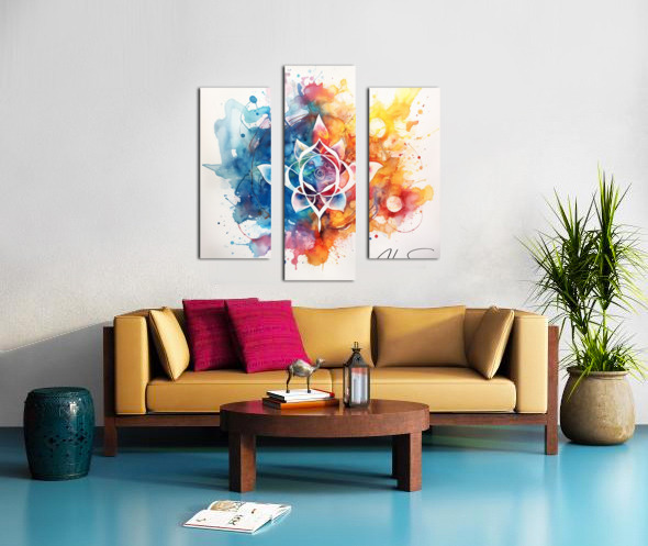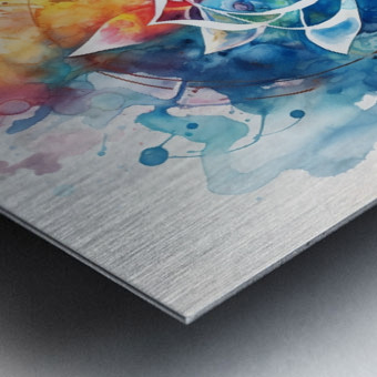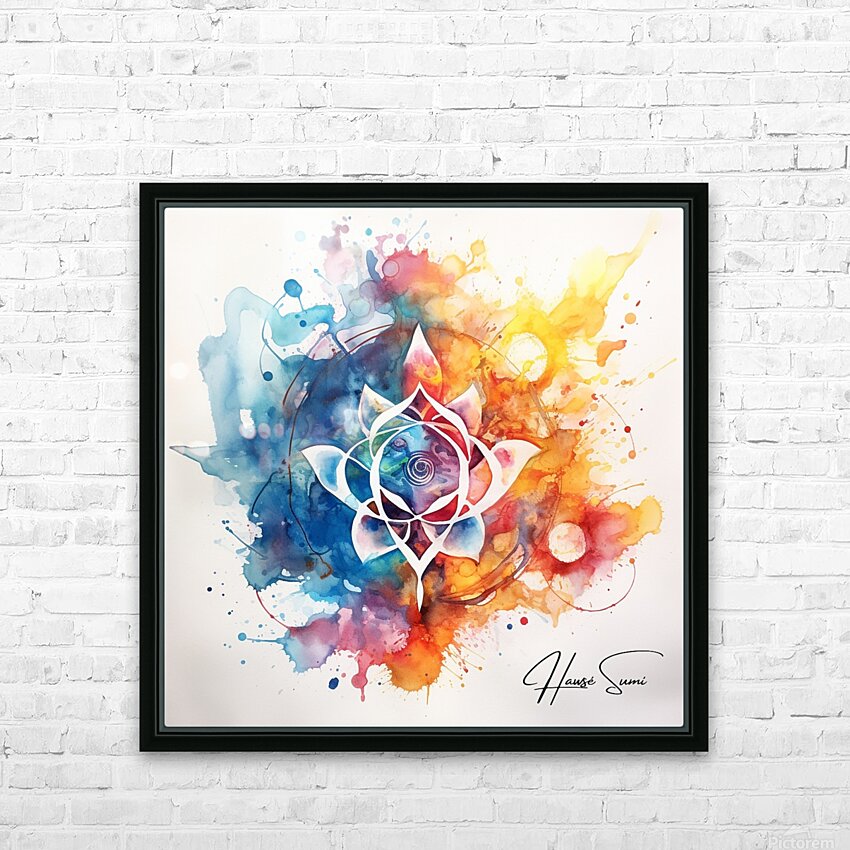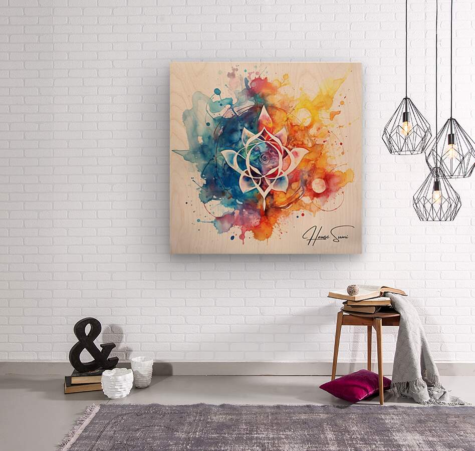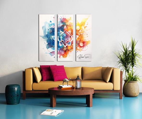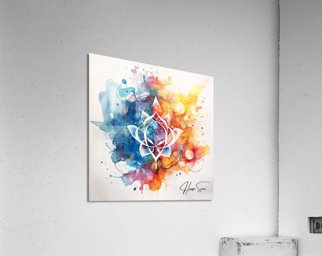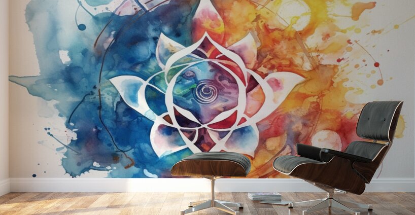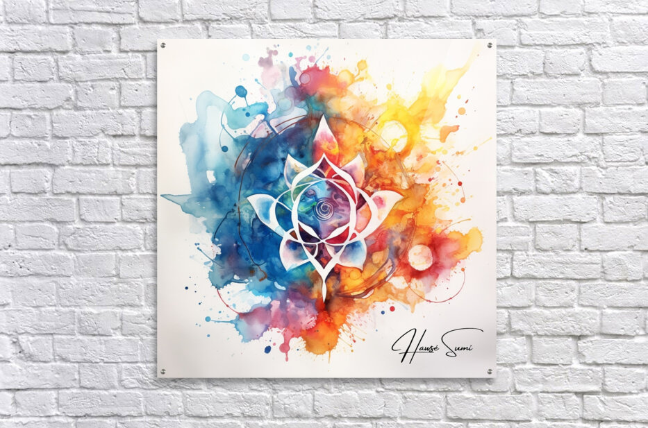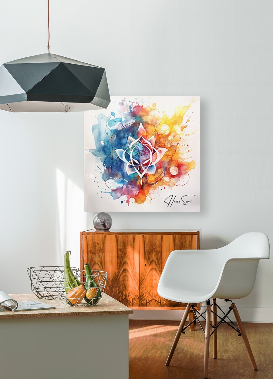 A stunning fusion of watercolor and abstract design, this piece features a central lotus flower surrounded by a symphony of colorful splashes and intricate details. The vibrant hues of blue, pink, orange, and yellow blend harmoniously, creating a sense of tranquility and balance.
