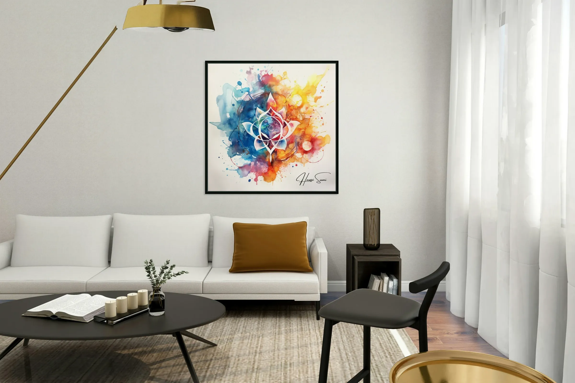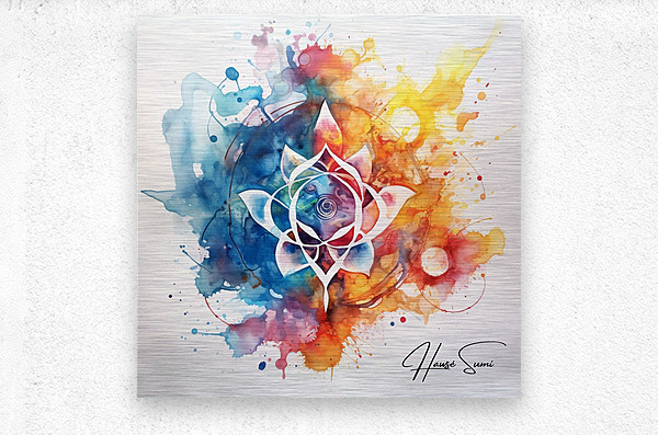 A stunning fusion of watercolor and abstract design, this piece features a central lotus flower surrounded by a symphony of colorful splashes and int...[+]