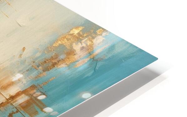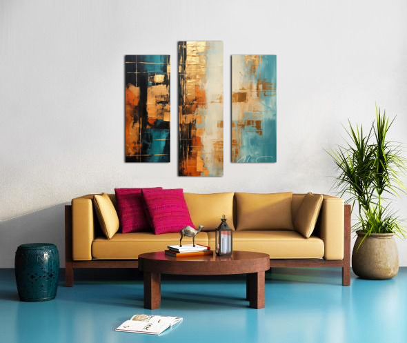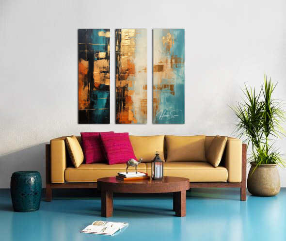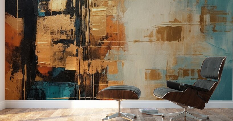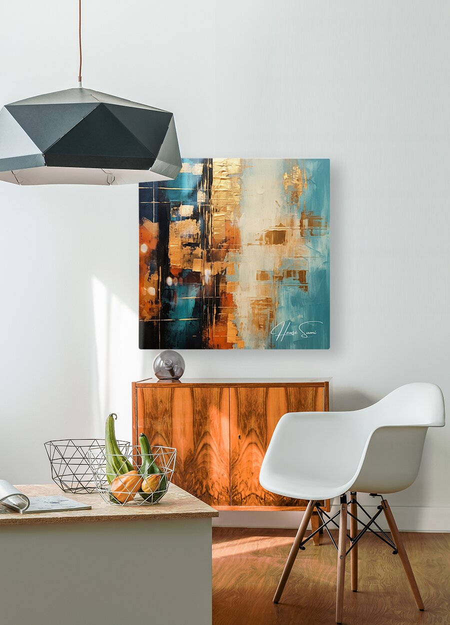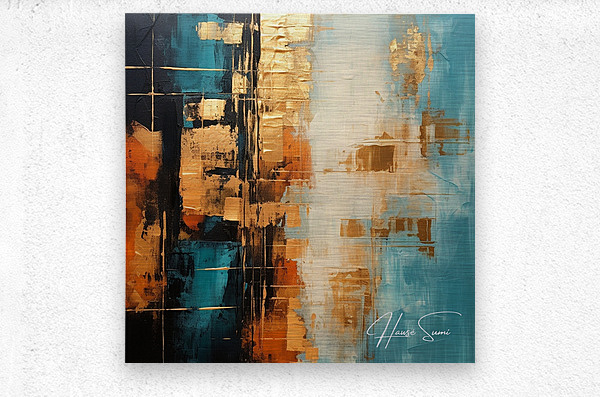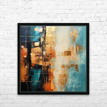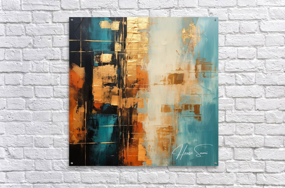 An abstract exploration of urban textures and colors, this piece combines elements of gold, turquoise, and black with a rich tapestry of layered forms and textures. The composition reflects the complexity and vibrancy of city life.
