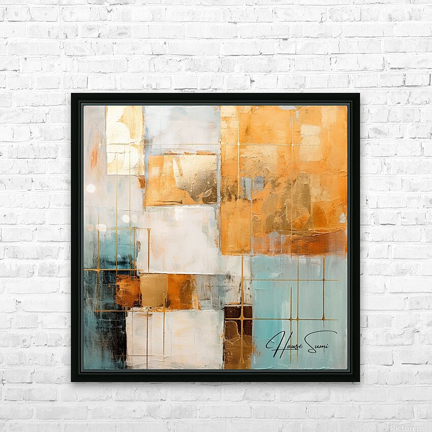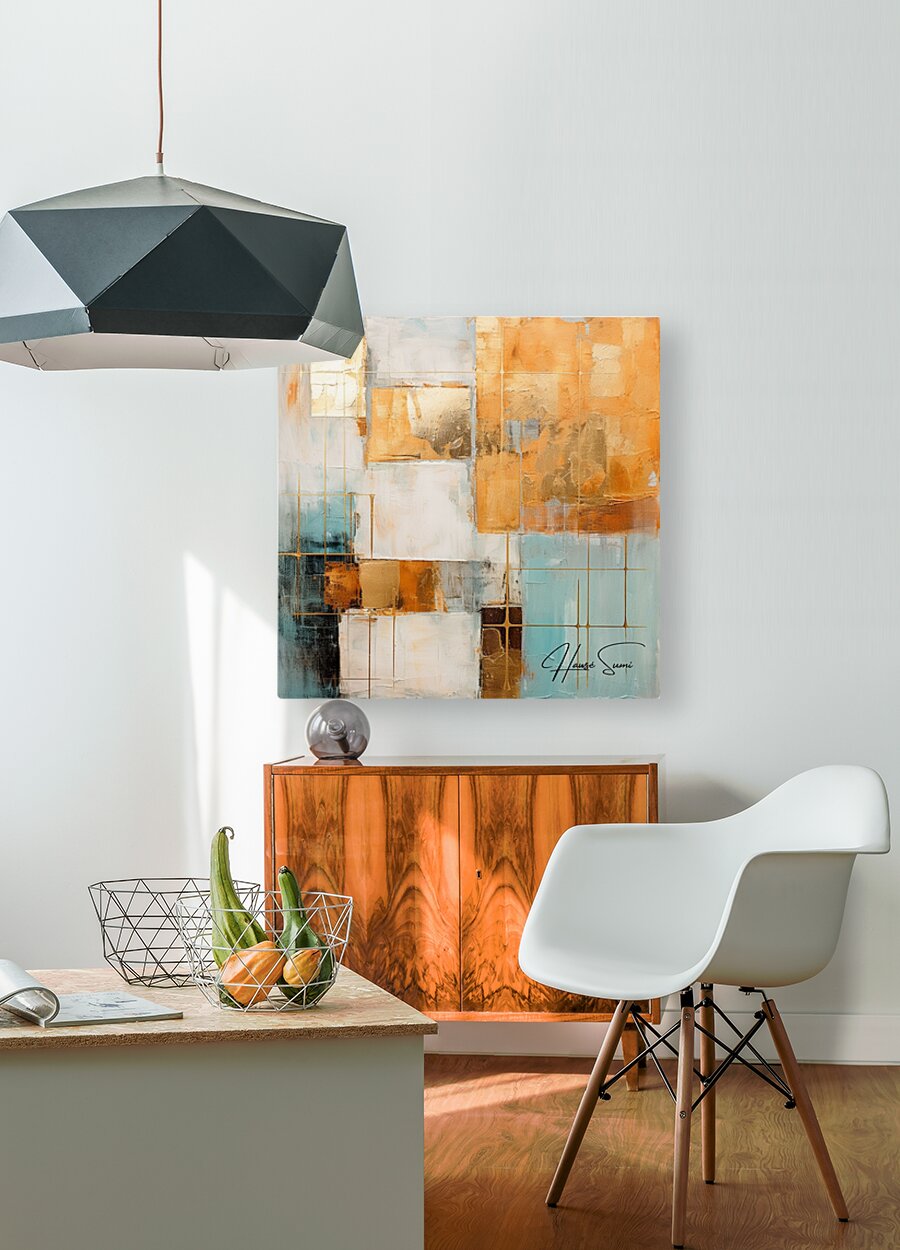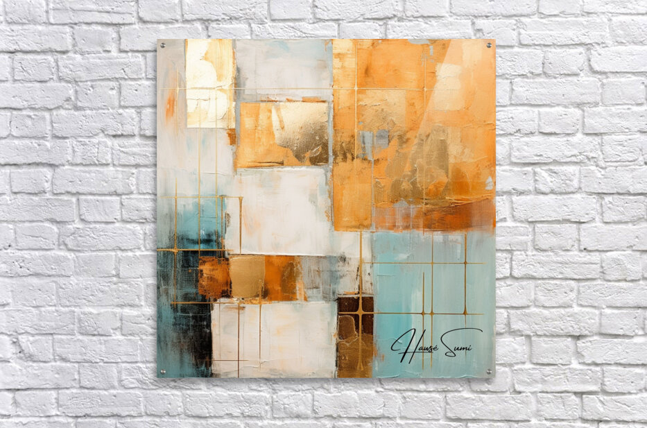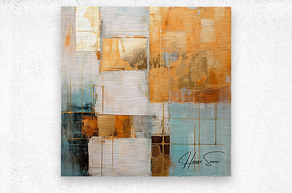 This abstract piece features a complex interplay of golden hues, white, and turquoise. The grid-like structures and overlapping layers create a sense of depth and intrigue, inviting the viewer to explore its intricate details.