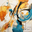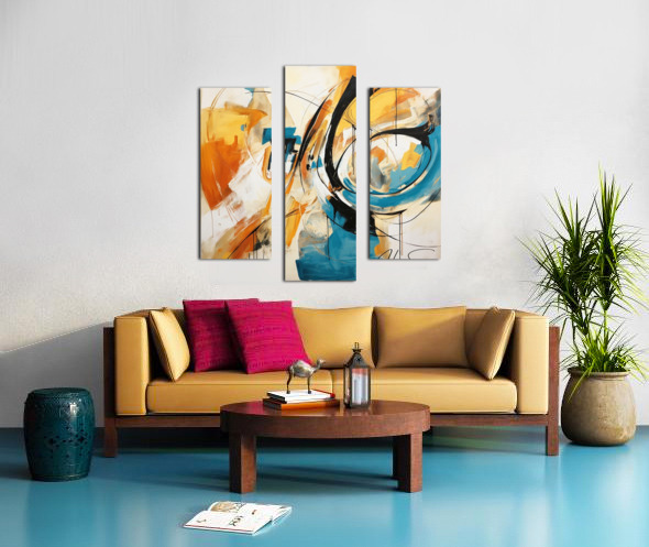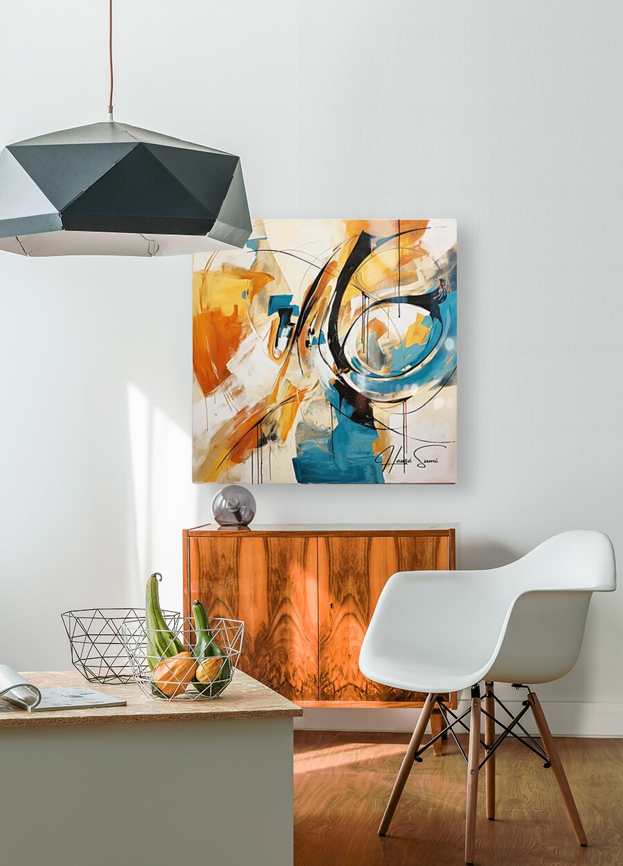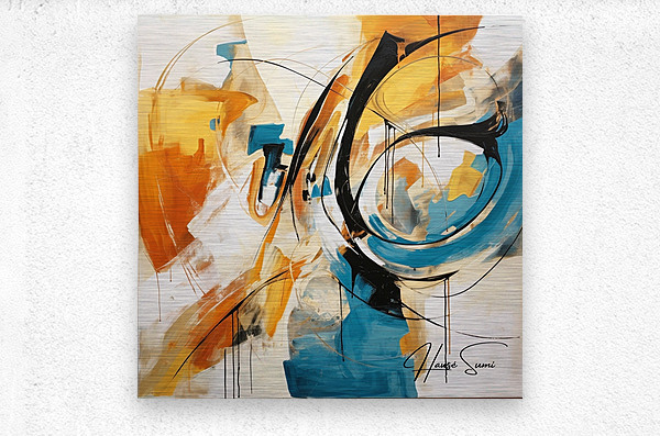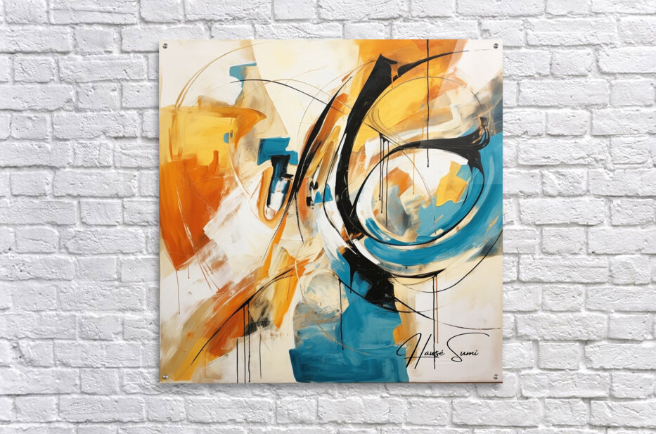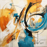 This painting bursts with energy and movement, featuring dynamic swirls and vibrant splashes of blue, orange, and black. The sweeping curves and bold lines create a sense of dance and rhythm, capturing the viewer's attention with its lively composition.