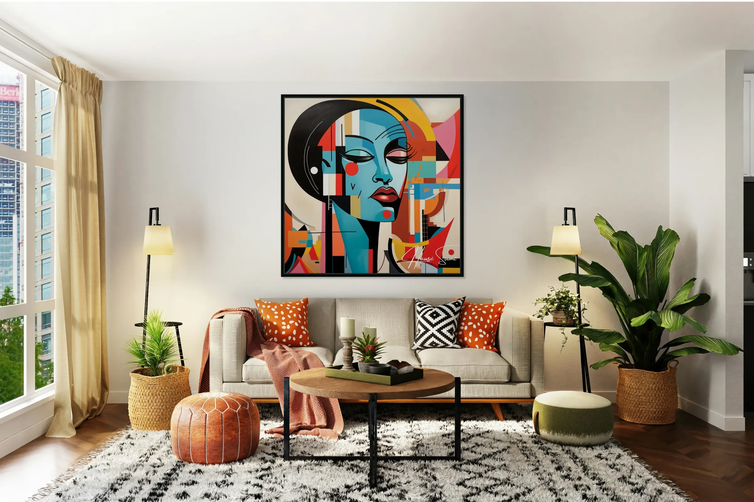 This painting captures the essence of a contemporary muse, blending vibrant geometric shapes with serene facial features. It symbolizes the harmony between modernity and tradition, reflecting the muse's ability to inspire in a rapidly changing world.