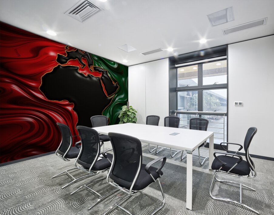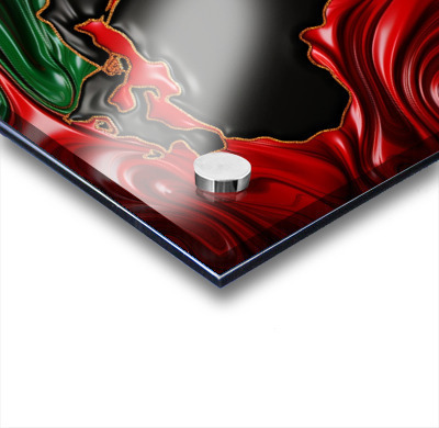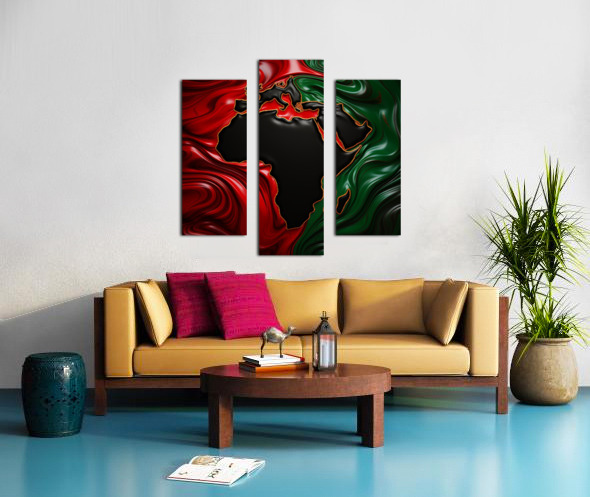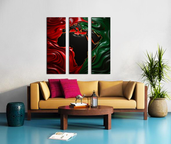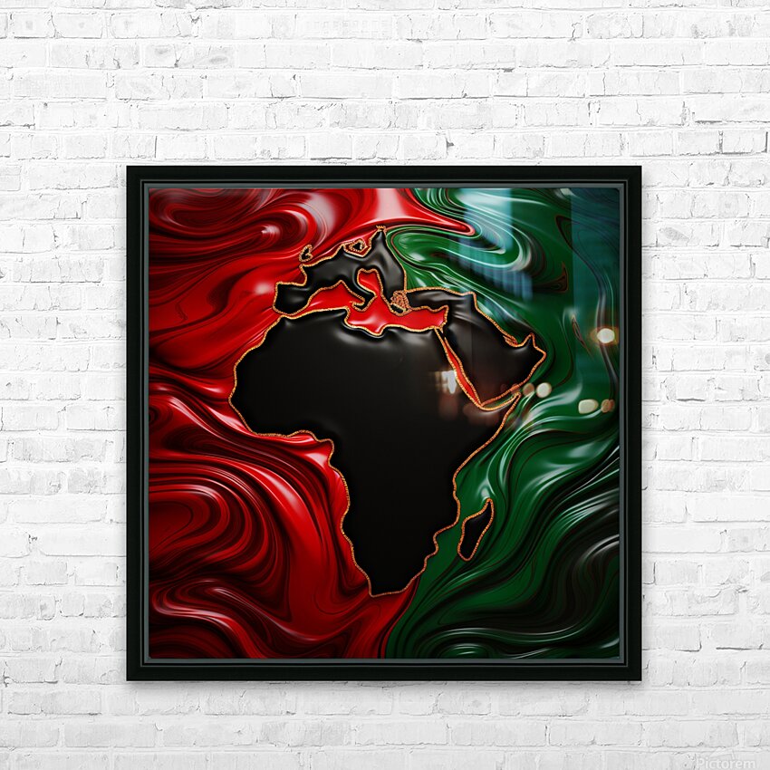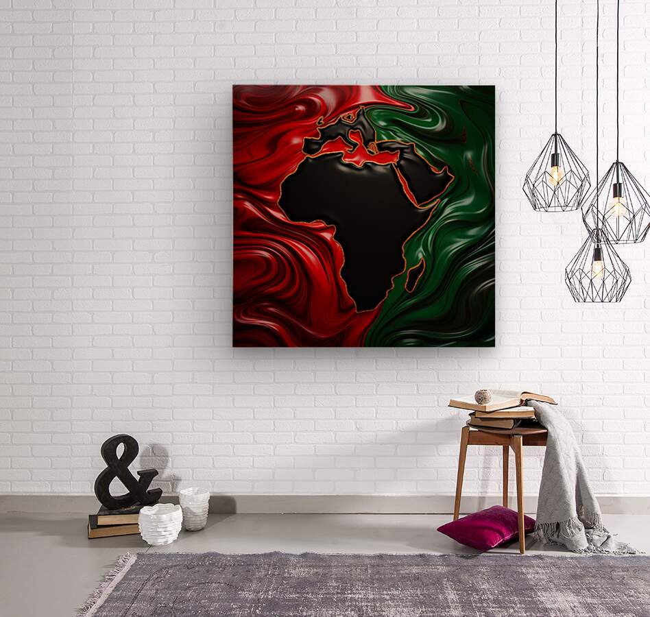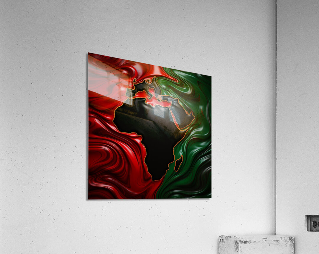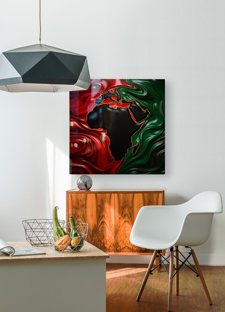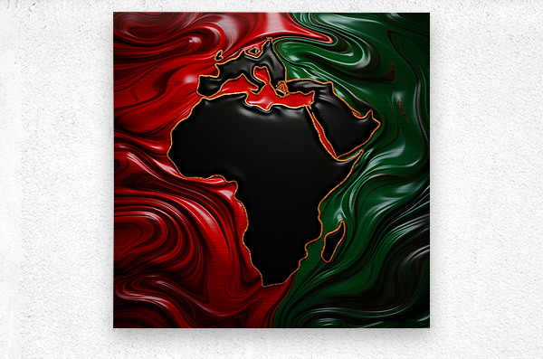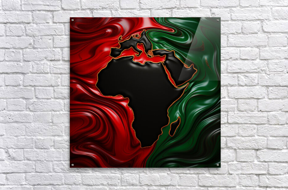 “Mother Africa - V" is a striking depiction of the African continent, rendered in rich, swirling hues of red, green, and black. The bold contrast of the matte black silhouette against the glossy, fluid background symbolizes the continent's profound history and vibrant future. The intricate golden outline adds a touch of regality, representing Africa's wealth of culture, resources, and heritage. This piece celebrates the unity, strength, and resilience of the African people, showcasing the dynamic and enduring spirit of the continent.