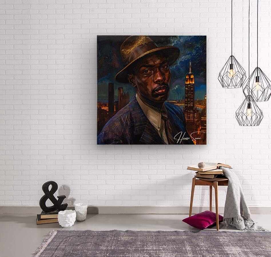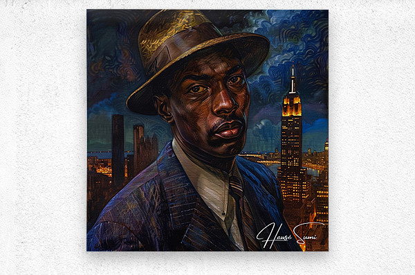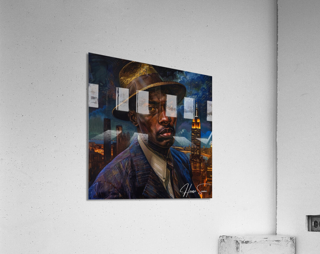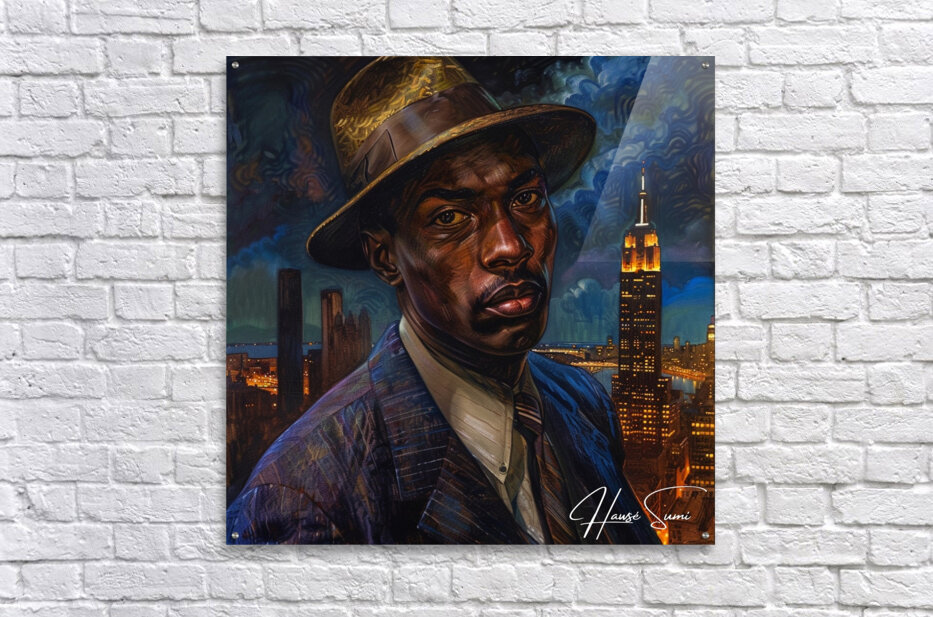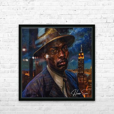 "Urban Eyez" captures the sophisticated demeanor of a man in a cityscape, with a striking backdrop of iconic buildings. His stylish attire and compose...[+]