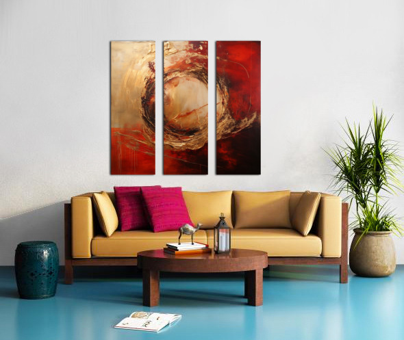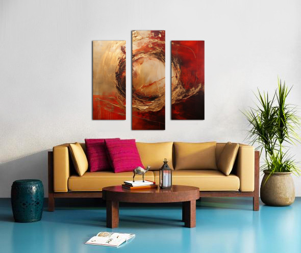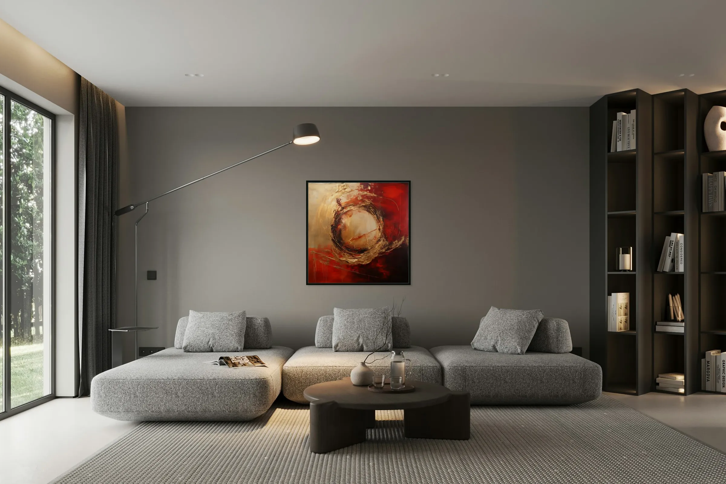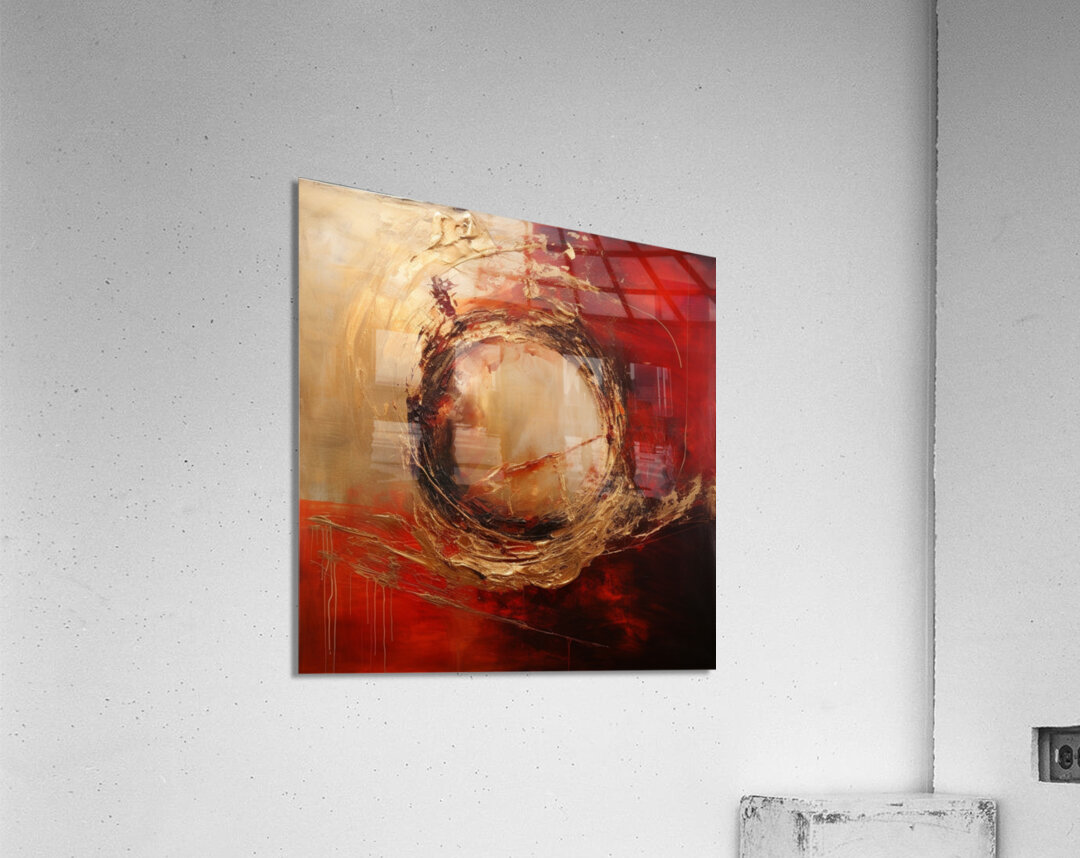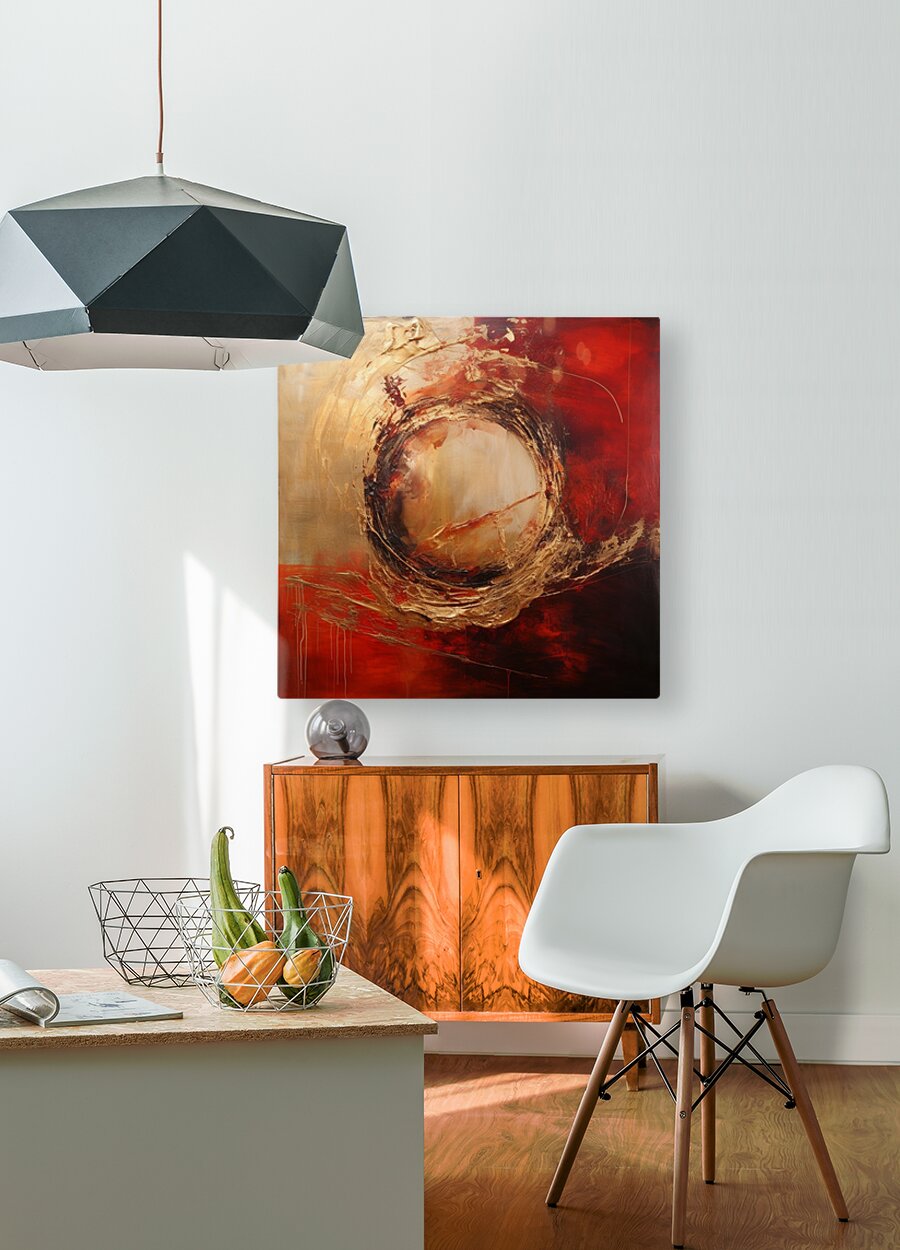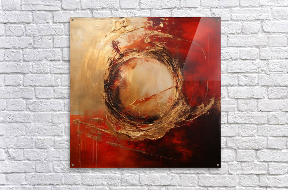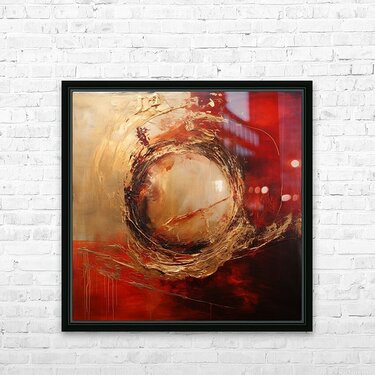This abstract piece, titled "Whirlwind of Creation," captures the dynamic energy of the artistic process. The swirling gold and crimson strokes symbolize the birth of ideas, with the center representing the focal point of inspiration. This artwork conveys the chaotic yet beautiful nature of creativity, where every brushstroke contributes to the masterpiece.