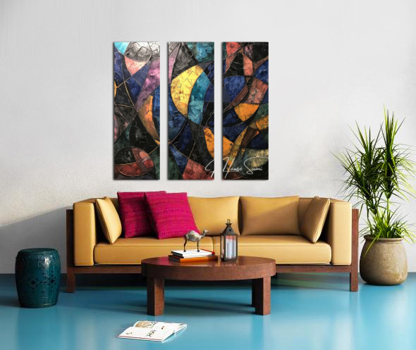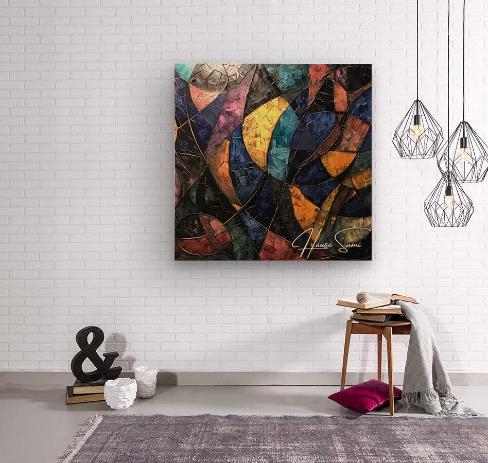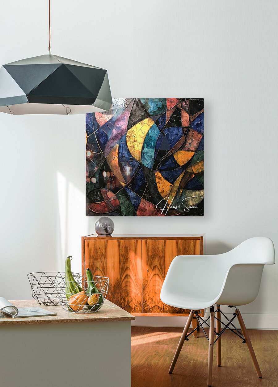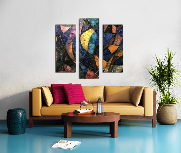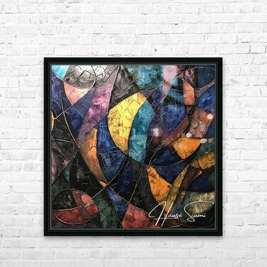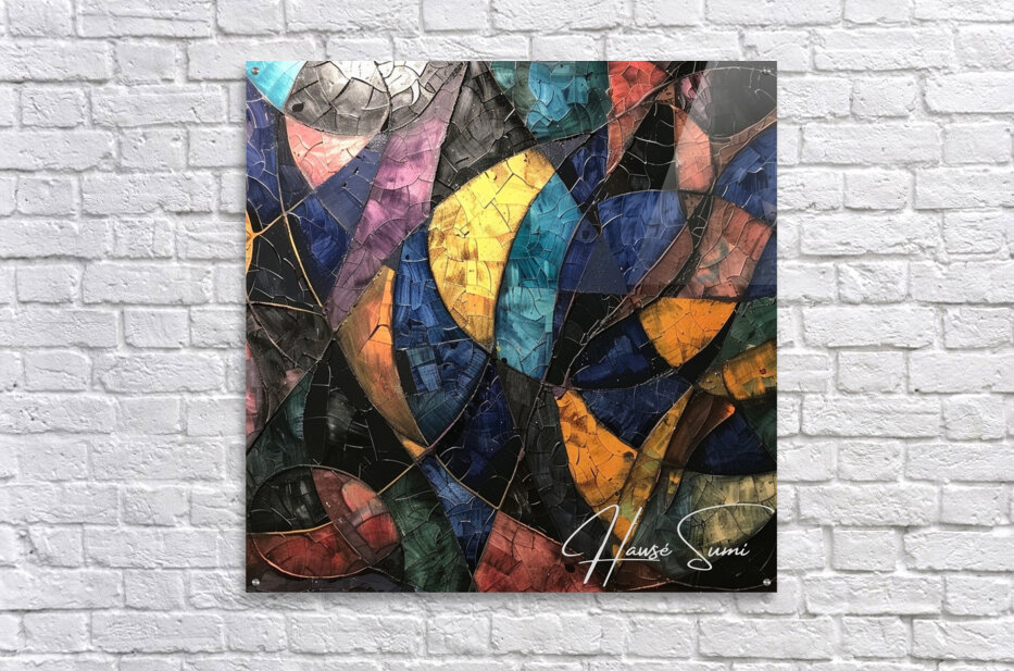 This artwork uses fractured shapes and bold colors to depict a fragmented reality. Each piece fits together to form a complex whole, symbolizing the multifaceted nature of human perception and experience.