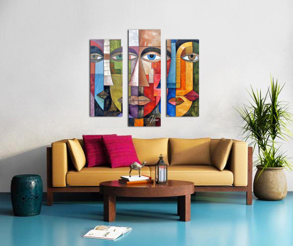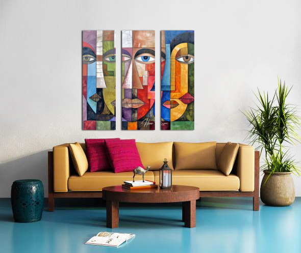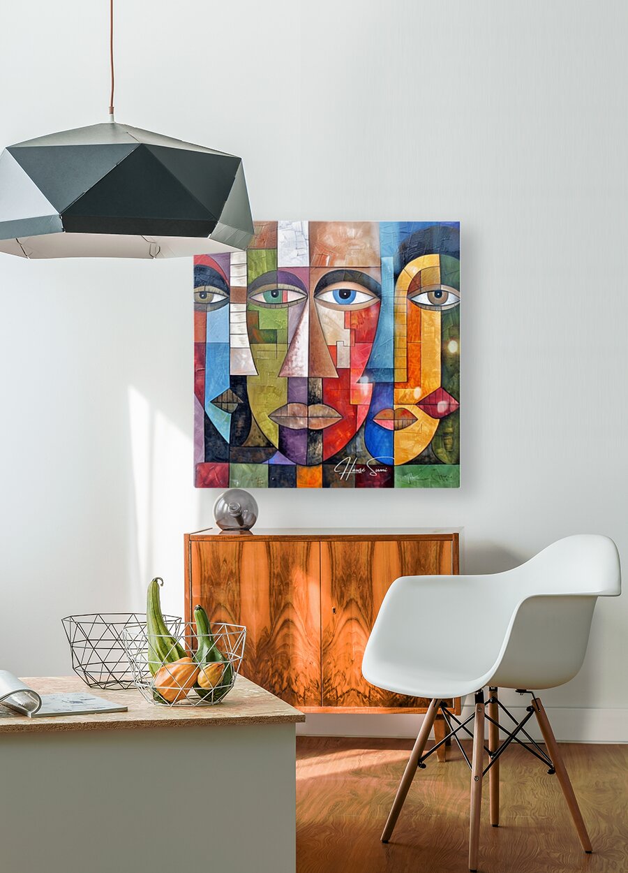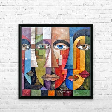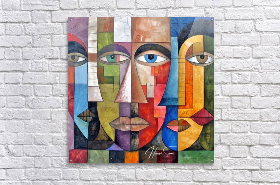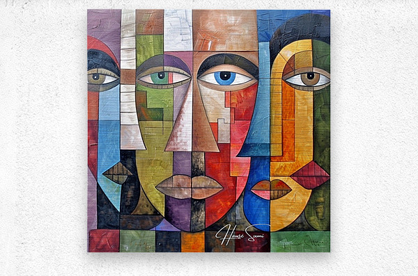 This vibrant painting captures the complex emotions and inner worlds of three individuals through a mosaic of vivid colors and abstract shapes. Each face, composed of intricate patterns and hues, tells a unique story of joy, sorrow, and contemplation, reflecting the multifaceted nature of human emotions.