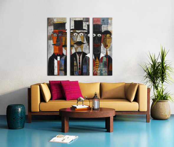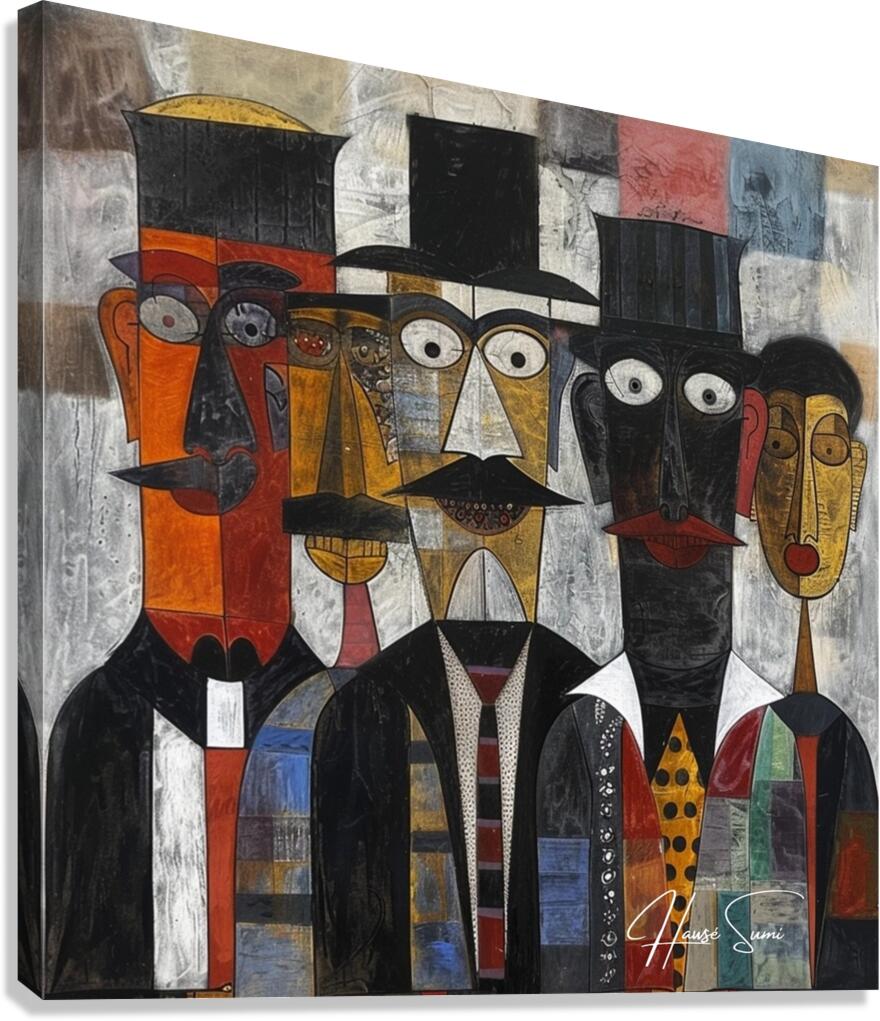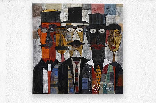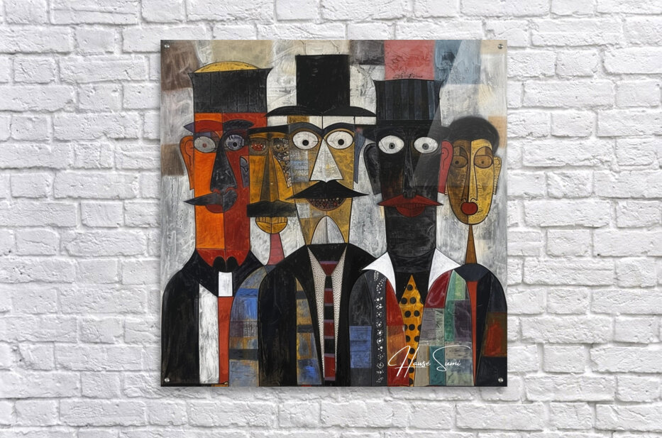 This piece, "The Gathering," features a group of distinguished figures in formal attire, each face meticulously detailed with geometric precision. The painting exudes a sense of unity and tradition, capturing a moment of collective presence and dignified conversation among the assembled individuals.