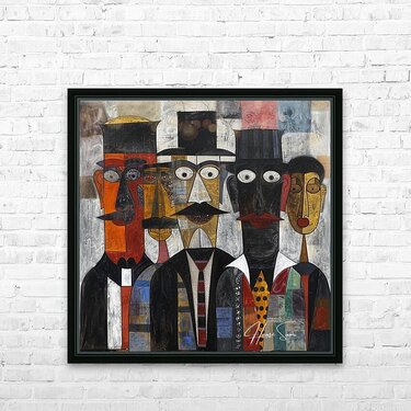 This piece, "The Gathering," features a group of distinguished figures in formal attire, each face meticulously detailed with geometric precision. The...[+]