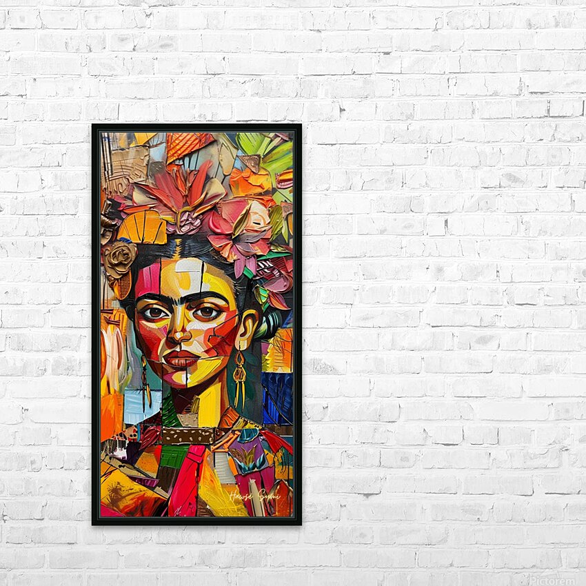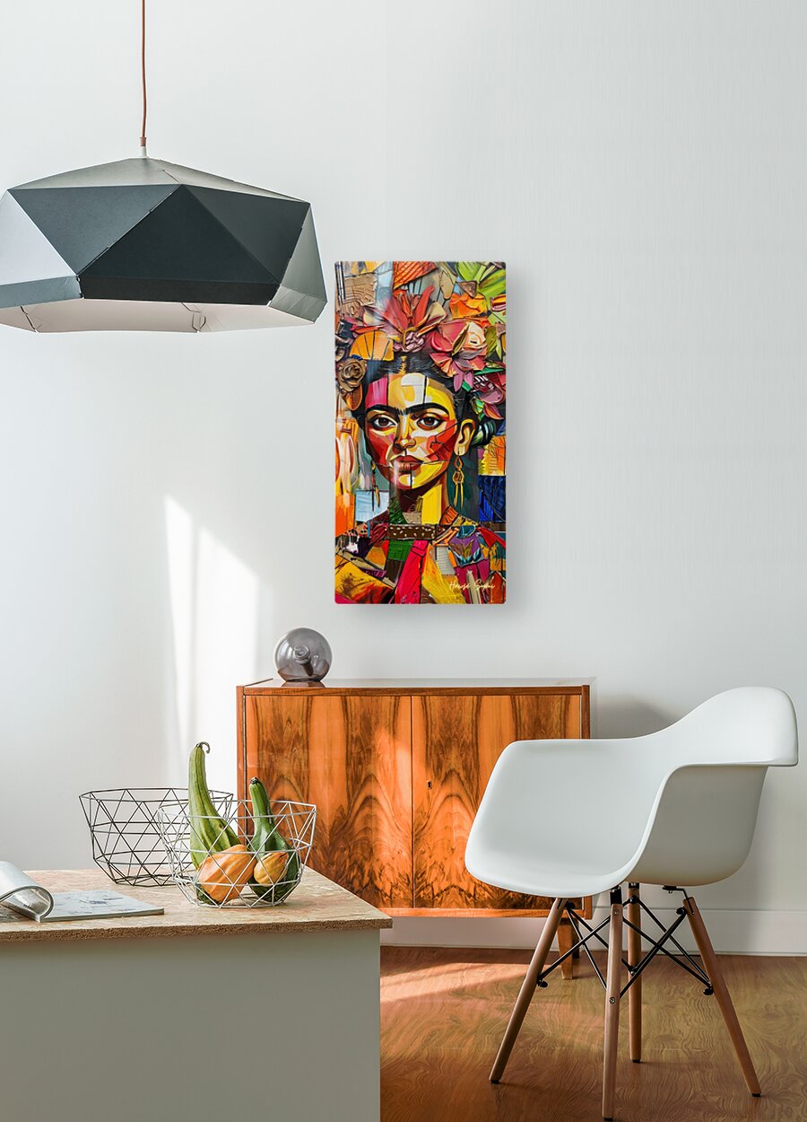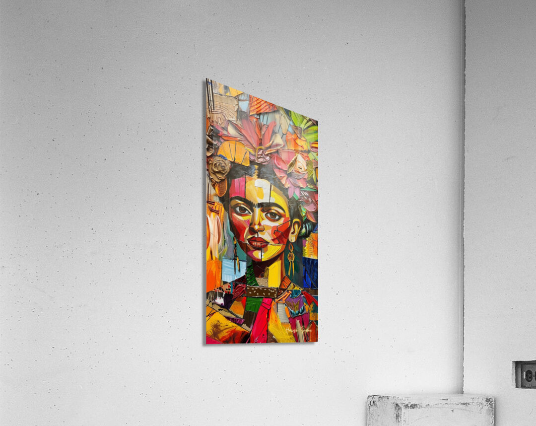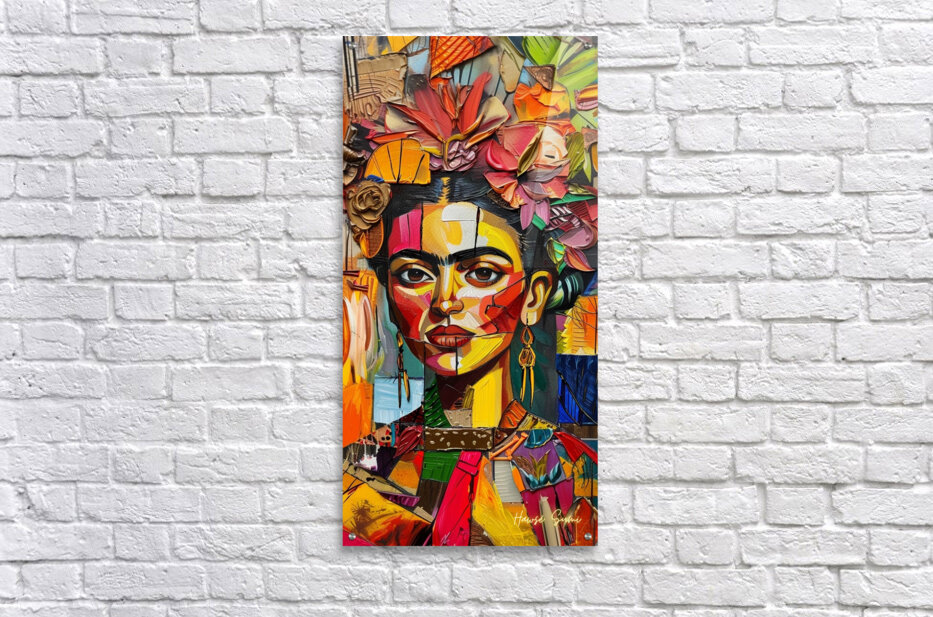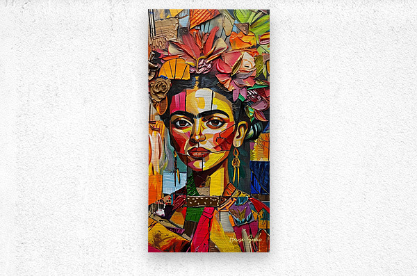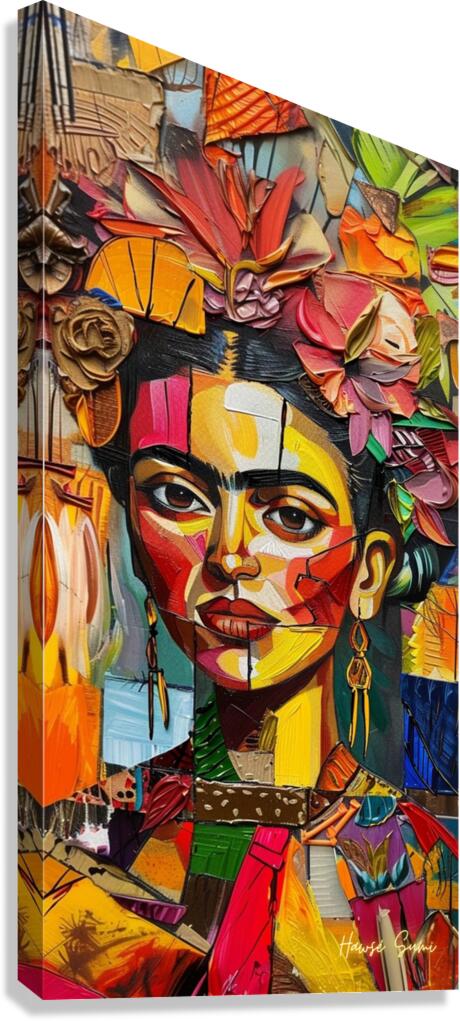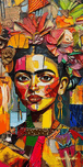 Frida's face emerges from a tapestry of colorful petals and leaves. The interplay of sharp lines and soft floral elements captures the duality of ...[+]