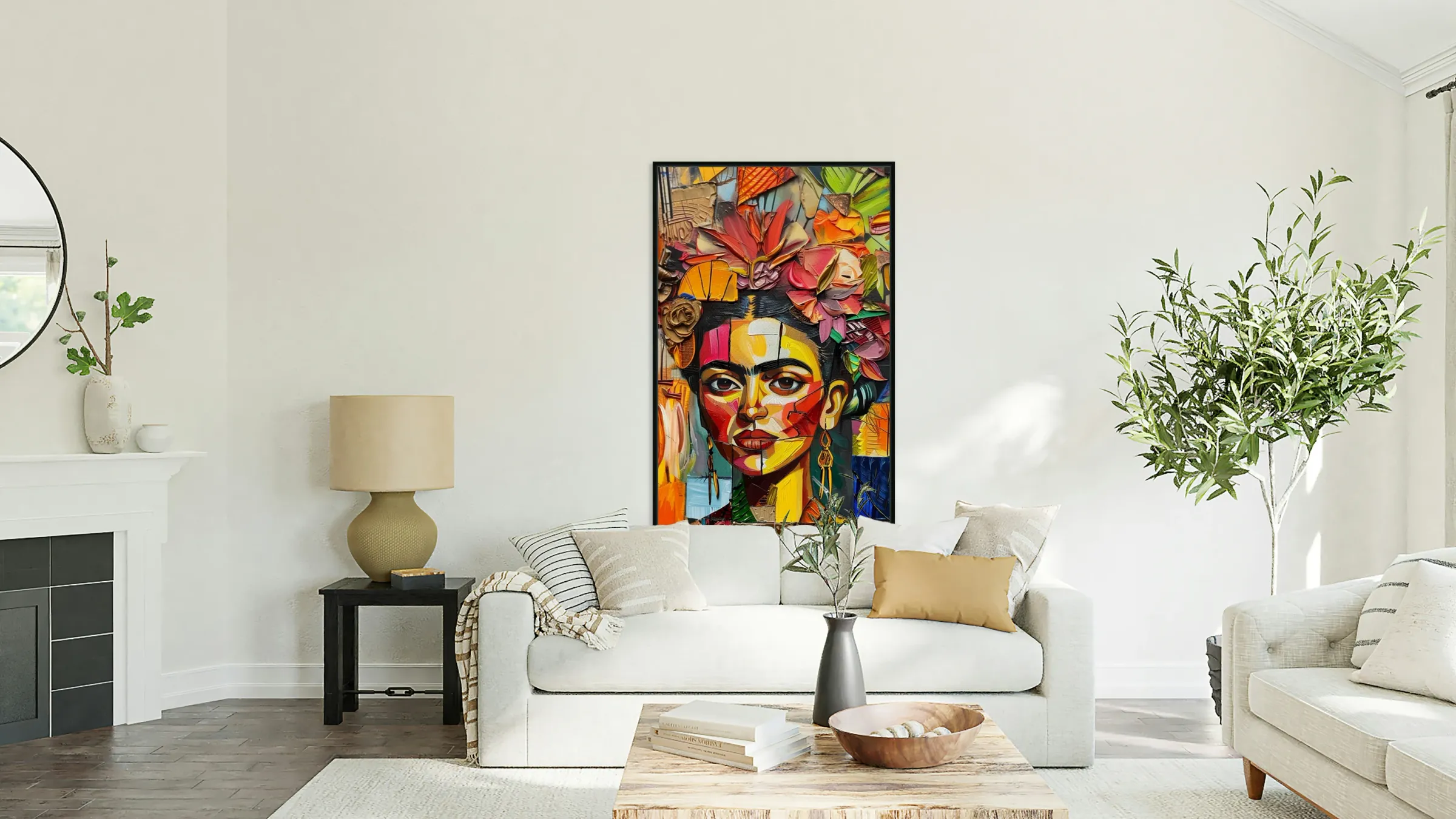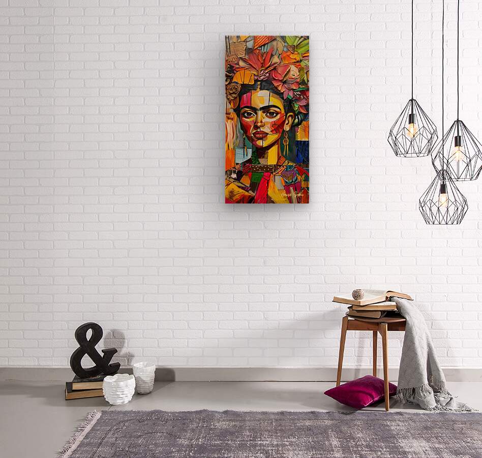 Frida's face emerges from a tapestry of colorful petals and leaves. The interplay of sharp lines and soft floral elements captures the duality of her life—her profound suffering and her immense passion for art. The flowers serve as a metaphor for growth and resilience despite adversity.