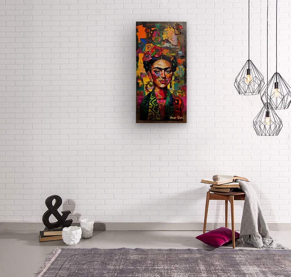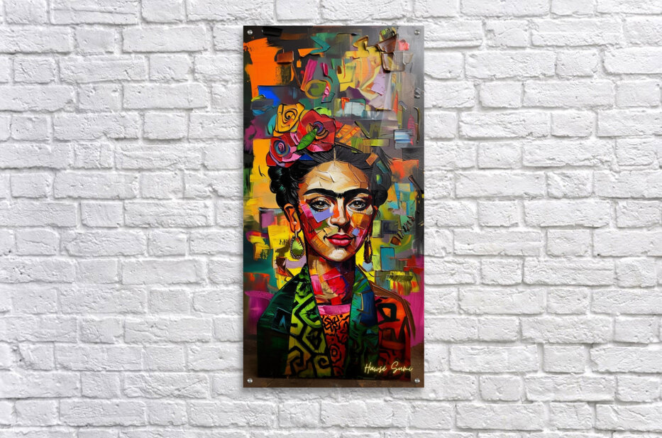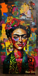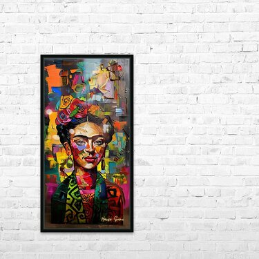 This portrait presents Frida Kahlo enveloped in a mosaic of bold, geometric shapes and lush, vibrant flowers. The composition conveys the complexity and richness of her inner world. The flowers are not just decorative but represent the beauty that can arise from brokenness, much like Frida's ability to create stunning art from her personal pain.