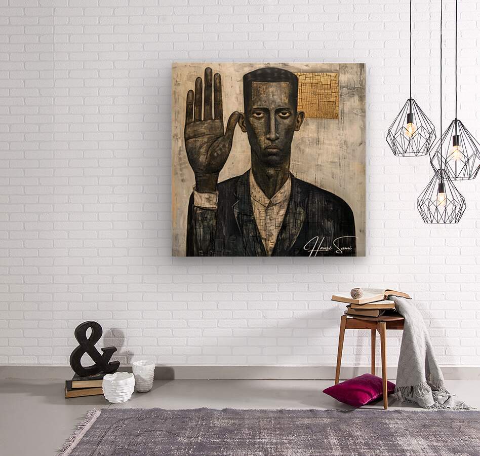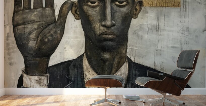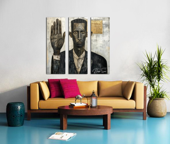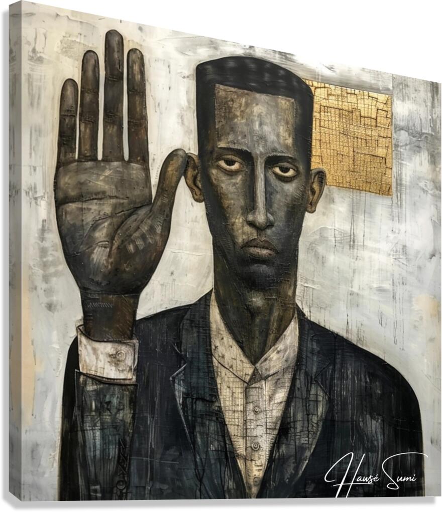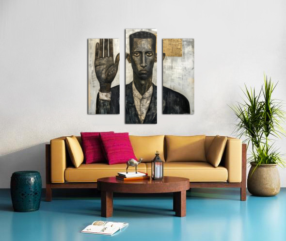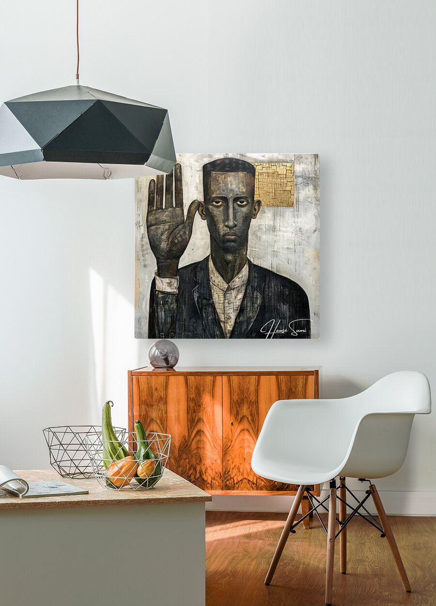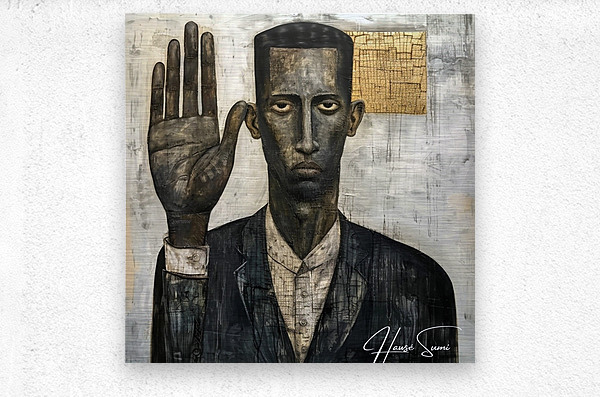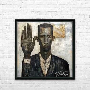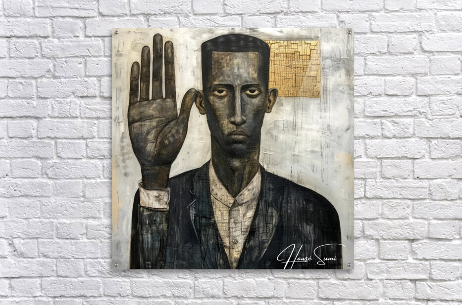 "The Oath" portrays a black man with a solemn expression, his hand raised in a gesture of commitment. The mixed media approach adds layers of meaning and texture, suggesting the weight of promises and the depth of personal integrity. The abstract elements in the background hint at the complexities and unseen challenges of upholding one's word.