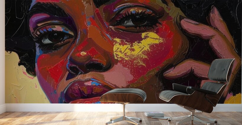 This painting captures a moment of deep introspection, where the subject's vibrant and expressive face is highlighted by bold strokes of red, yellow, and blue. The abstract style, combined with the detailed features, evokes a sense of inner contemplation and emotional depth.