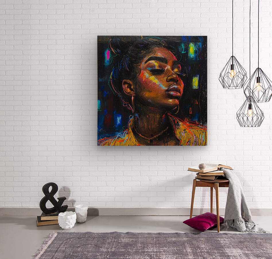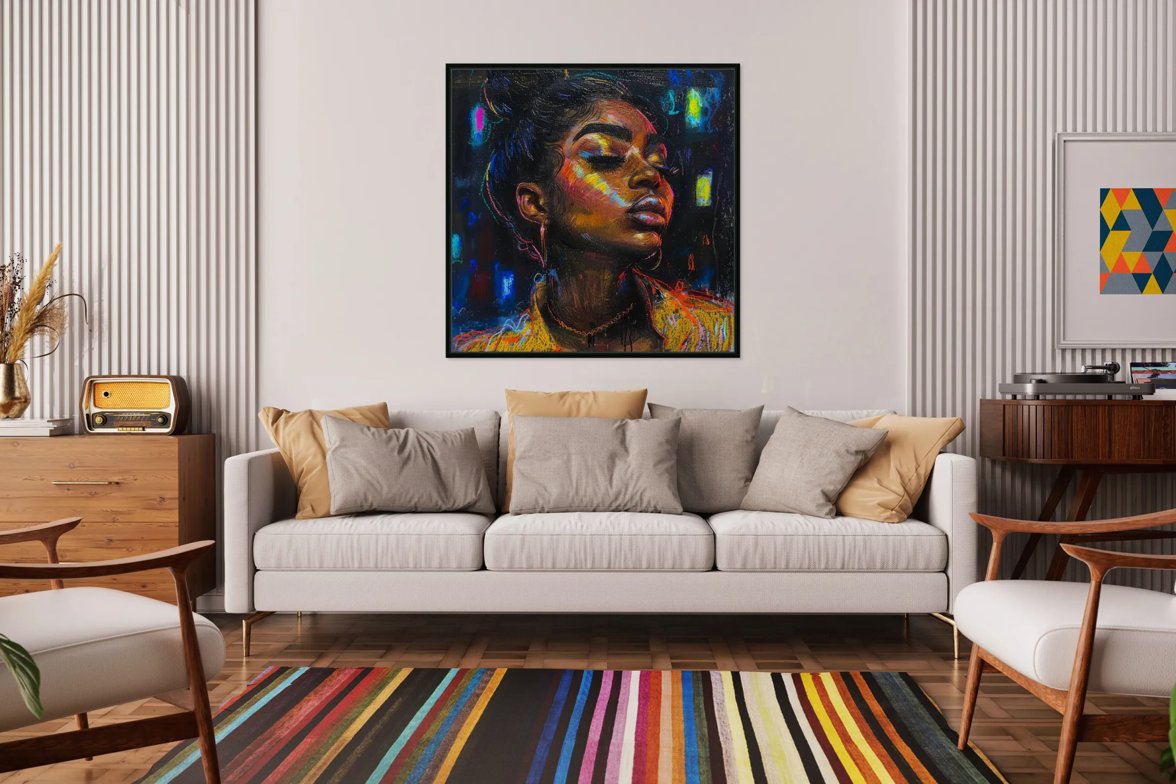 City Dreams" portrays a young woman lost in thought amidst the vibrant lights of a bustling metropolis. Her closed eyes and serene expression contrast with the dynamic background, representing her dreams and aspirations amidst the chaos of city life. This artwork emphasizes the power of introspection and the pursuit of personal goals.
