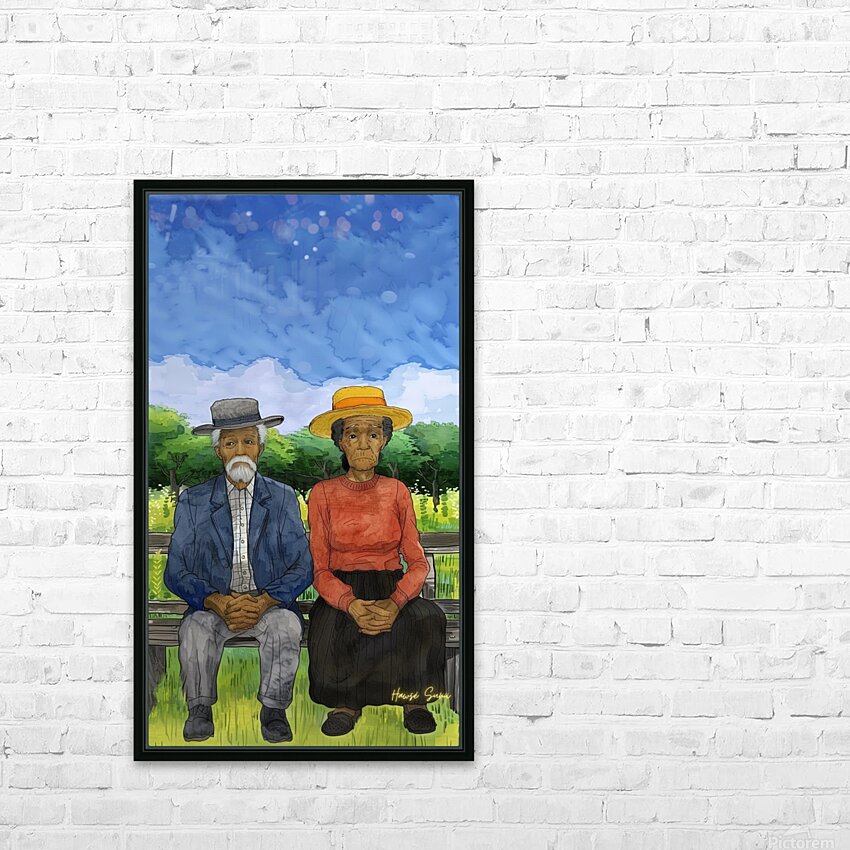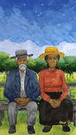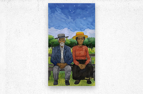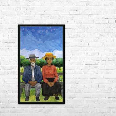 In "Fields of Reflection," an elderly couple sits thoughtfully on a bench amidst a lush, green landscape. Their somber attire contrasts with the vibra...[+]
