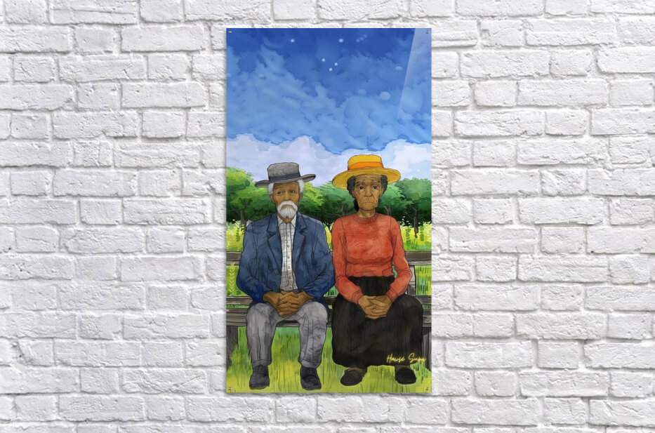 In "Fields of Reflection," an elderly couple sits thoughtfully on a bench amidst a lush, green landscape. Their somber attire contrasts with the vibrant surroundings, illustrating the rich tapestry of their lives. This scene captures the quiet moments of reflection and the enduring bond that has carried them through life’s ups and downs, framed by the beauty of nature.