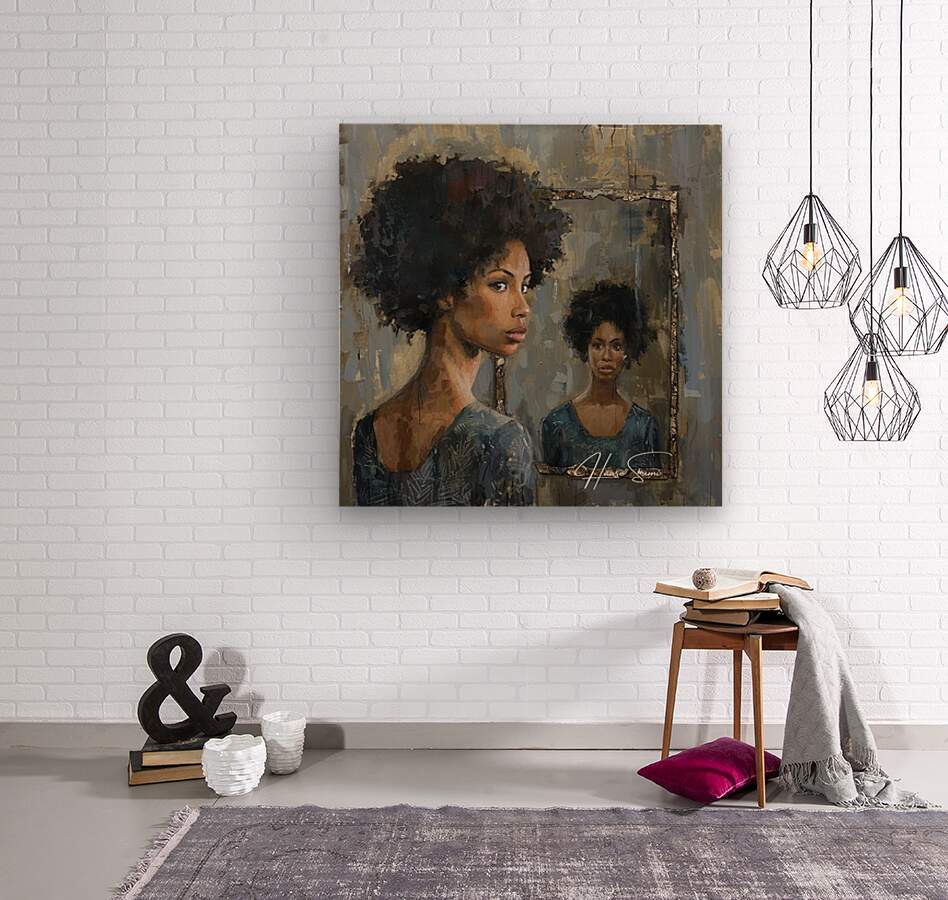 A woman with an afro hairstyle gazes into an old, ornate mirror, capturing a deeper, introspective view of herself. The painting conveys a sense of inner strength and vulnerability, inviting viewers to ponder the layers of their own souls.