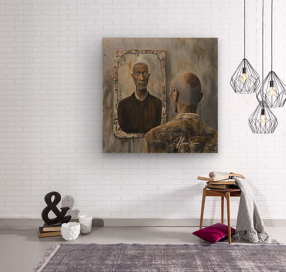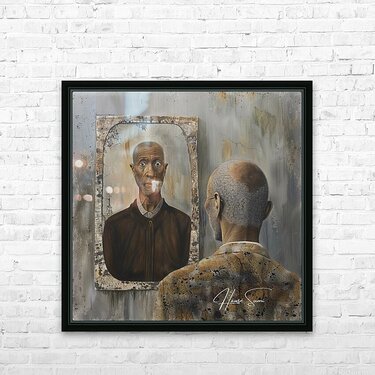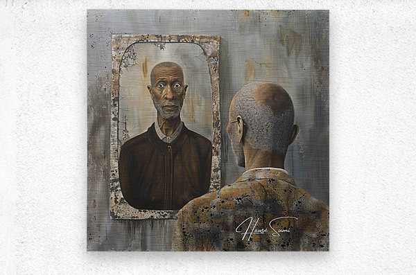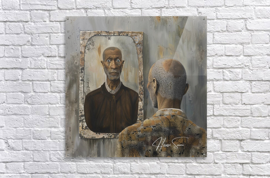 This painting depicts an elderly man gazing into a weathered mirror, seeing a younger version of himself. The cracked and aged mirror symbolizes the passage of time and the inner reflections that reveal the continuum of one's life experiences.