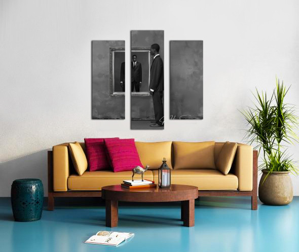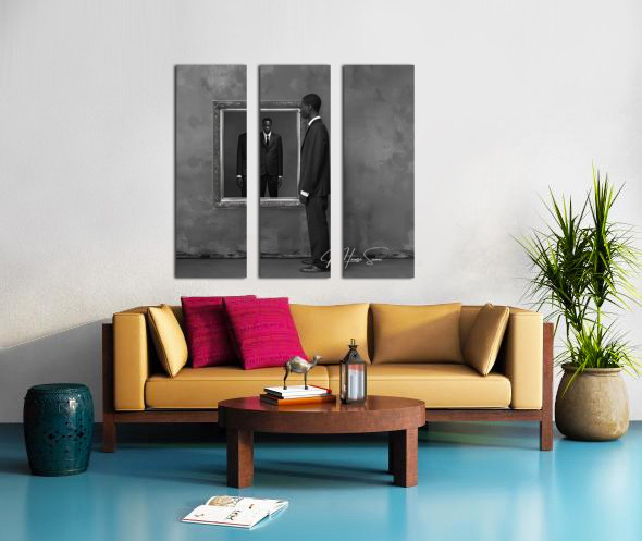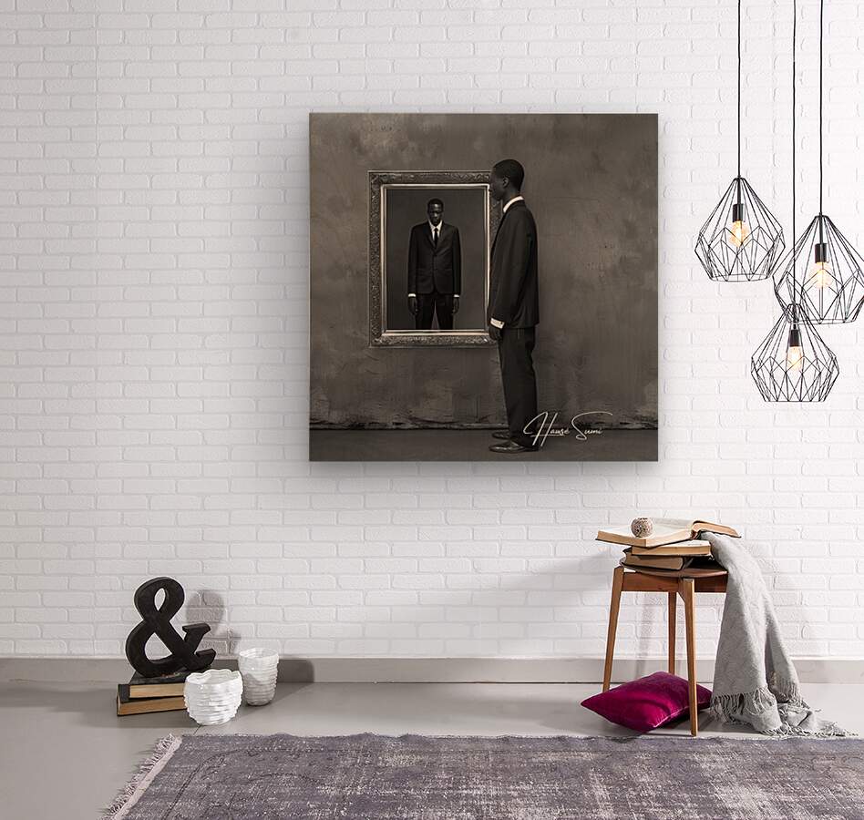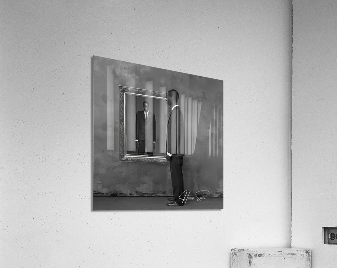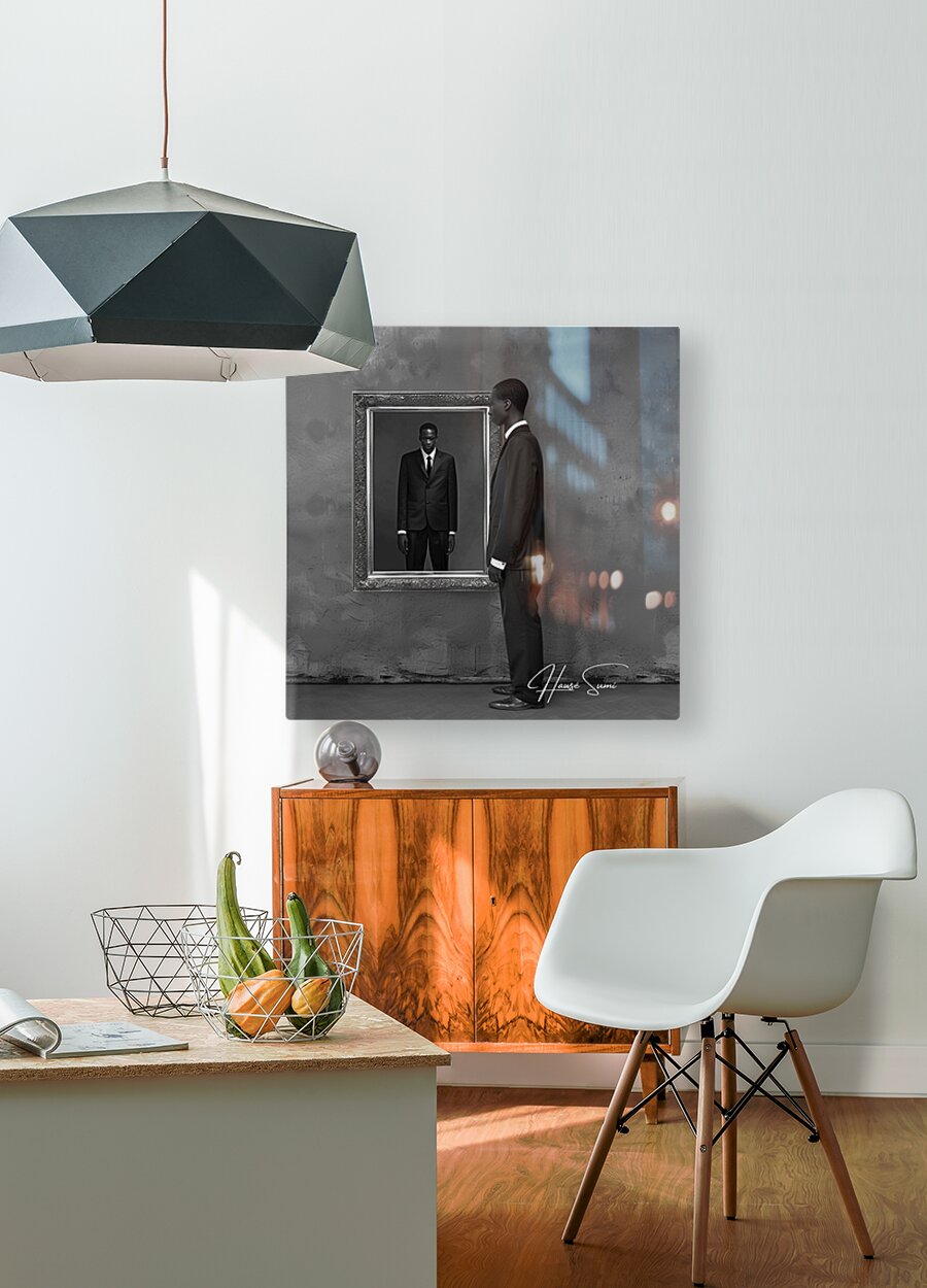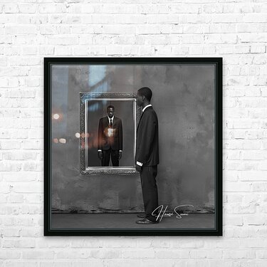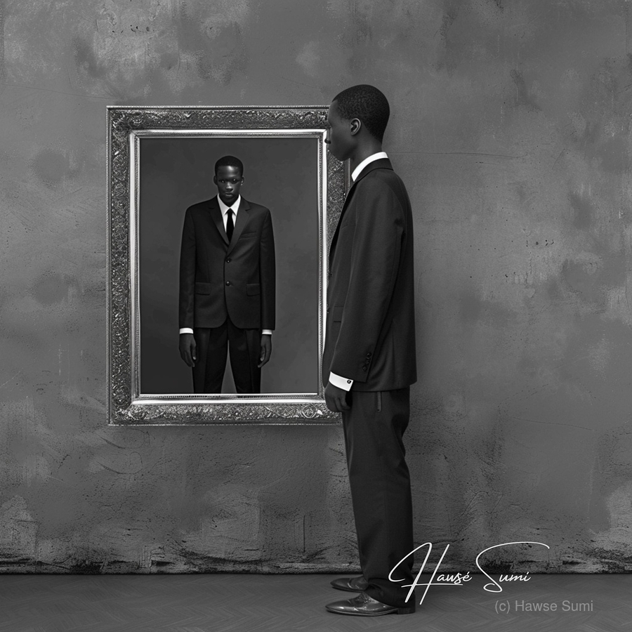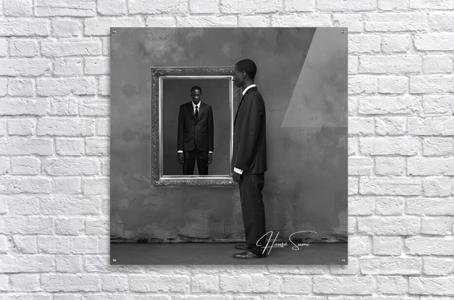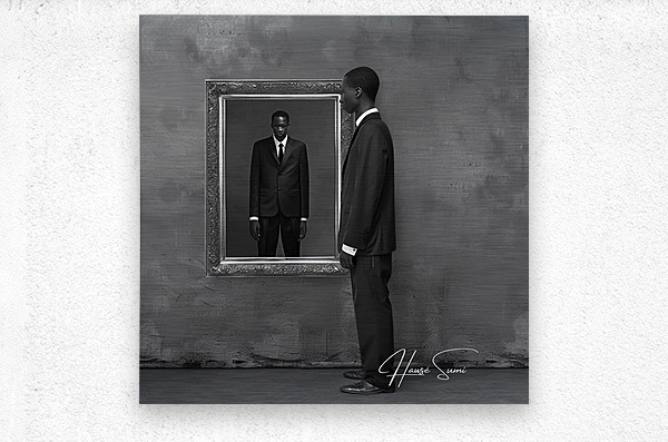 This painting portrays a young man in a suit standing in front of a mirror, facing his own reflection. The formal attire symbolizes aspirations, societal expectations, and personal identity, challenging the viewer to consider how we present ourselves to the world versus how we see ourselves internally.