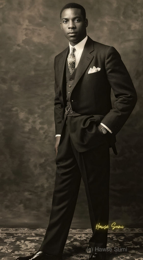 A young man in the 1950s exudes sophistication and confidence in his impeccably tailored suit. His sharp attire, complete with a pocket square and pol...[+]