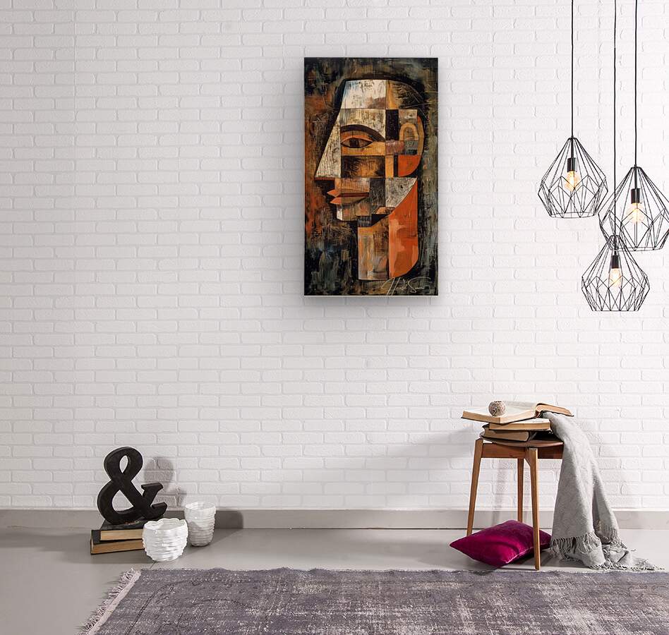 A contemplative abstract portrait rendered in a cubist style, using earthy tones of brown, orange, and grey. The layered textures and fragmented shapes give the piece a rustic yet sophisticated feel, highlighting the subject's thoughtful expression.
