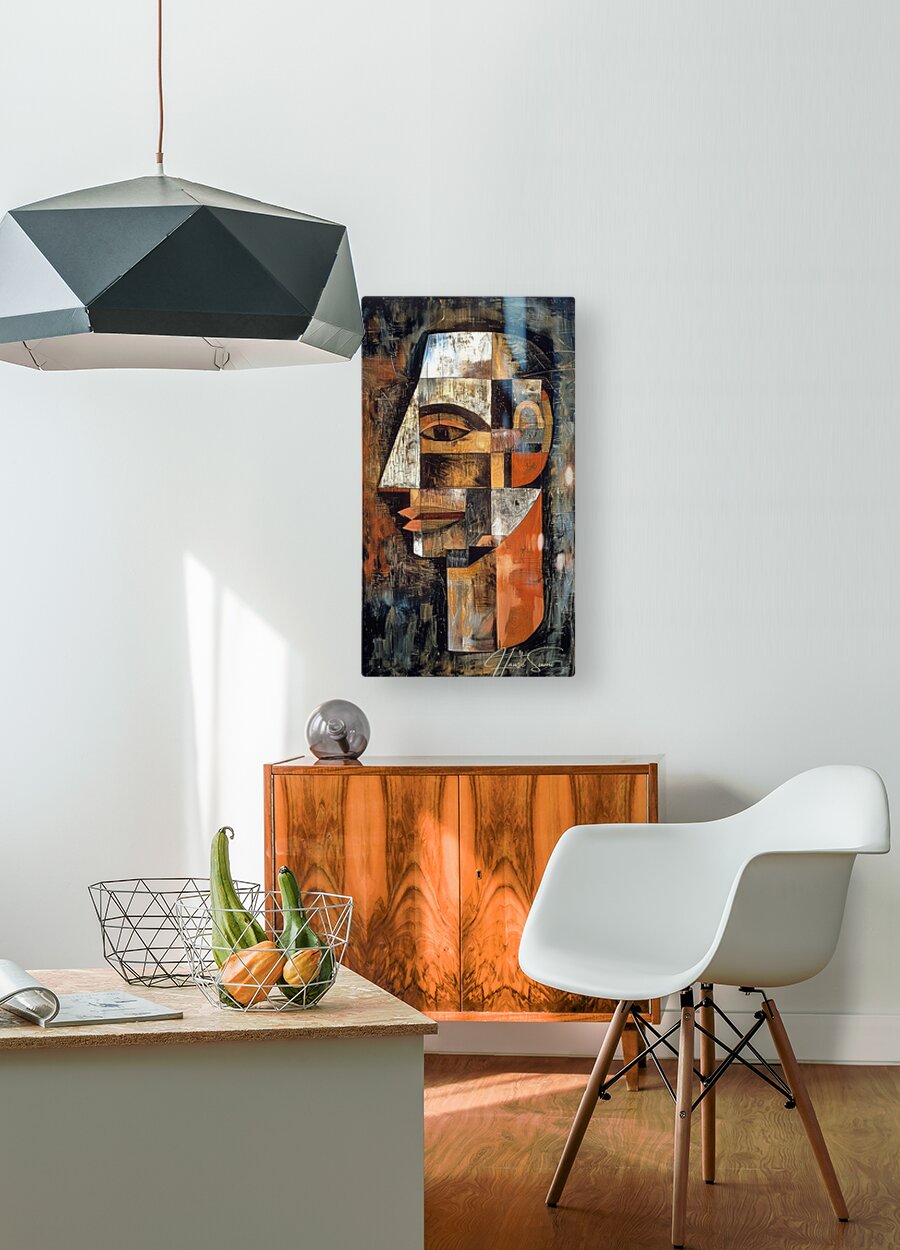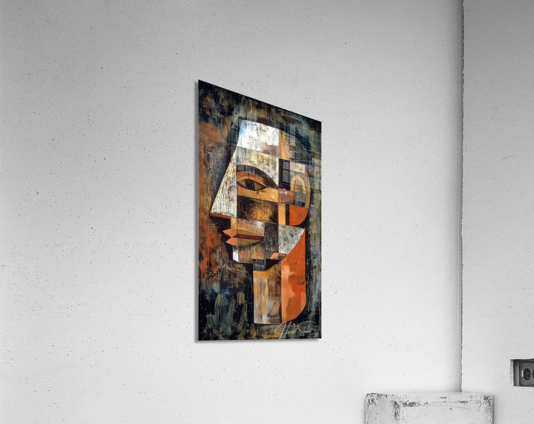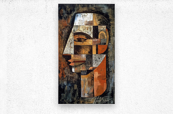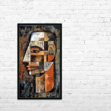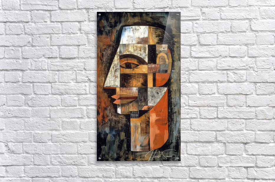A contemplative abstract portrait rendered in a cubist style, using earthy tones of brown, orange, and grey. The layered textures and fragmented shape...[+]