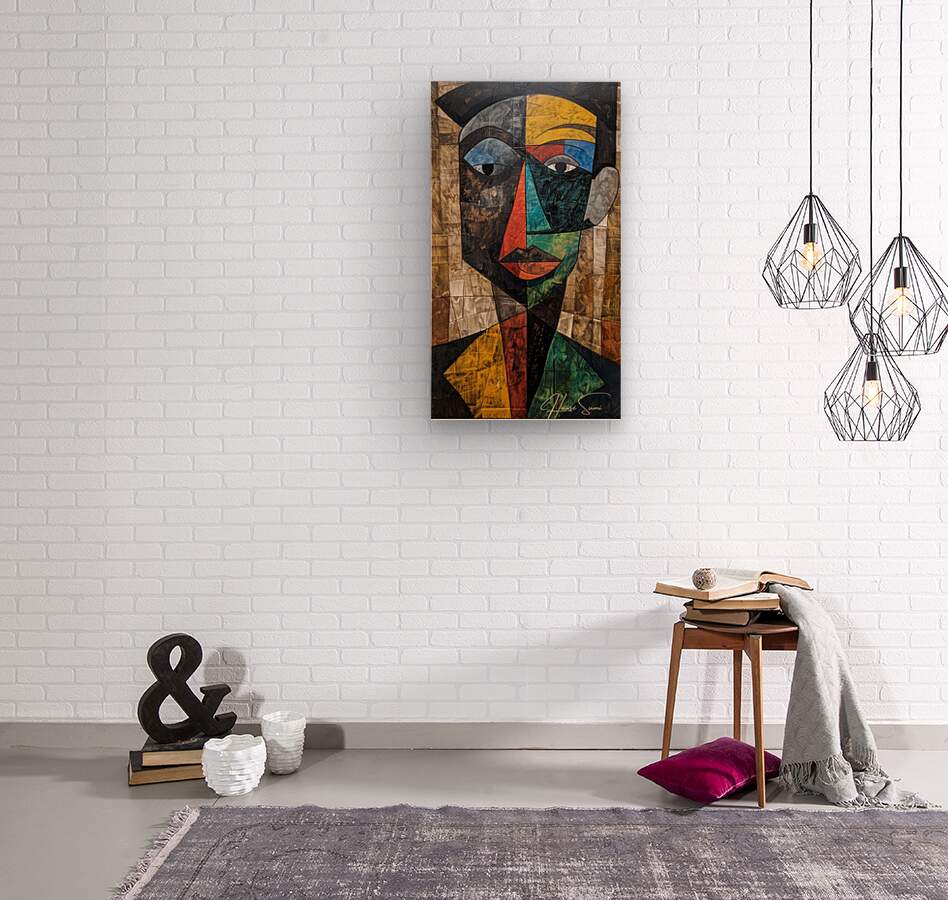 A vibrant, abstract portrait featuring a male figure composed of various geometric shapes and bold colors. The use of red, blue, green, yellow, and black creates a striking contrast, emphasizing the complexity and depth of the subject's expression.