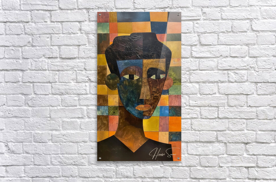 This abstract portrait showcases a male figure composed of a vibrant array of colored squares in the background, creating a patchwork effect. The use of deep blues, greens, and earthy browns in the face contrasts with the bright and warm hues behind, symbolizing a rich tapestry of emotions and experiences.