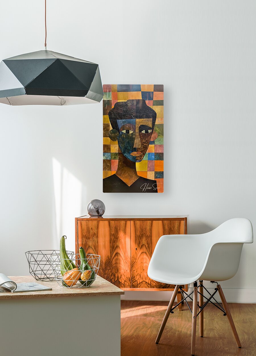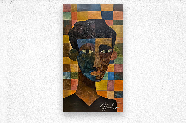 This abstract portrait showcases a male figure composed of a vibrant array of colored squares in the background, creating a patchwork effect. The use ...[+]