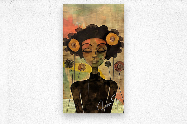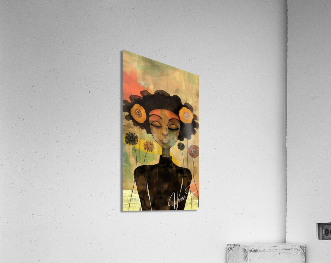 This artwork features a woman with a serene expression, surrounded by stylized flowers that seem to bloom from her hair. The soft, abstract background...[+]