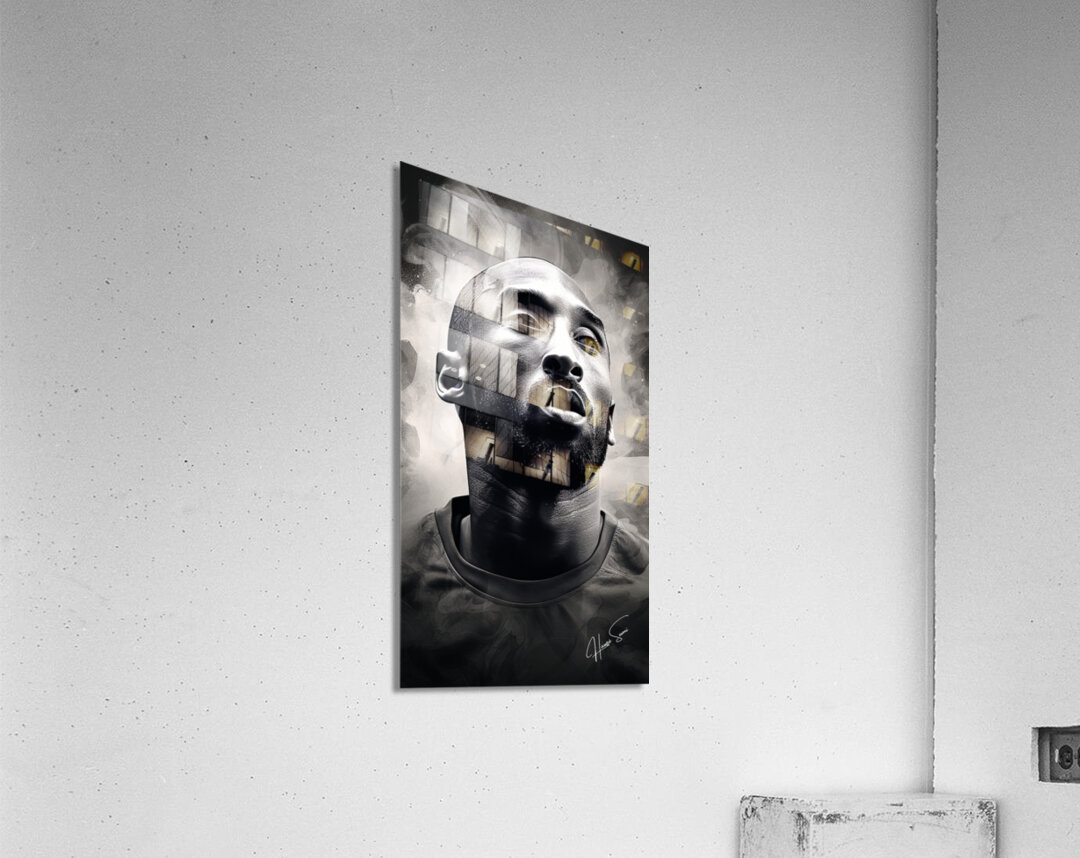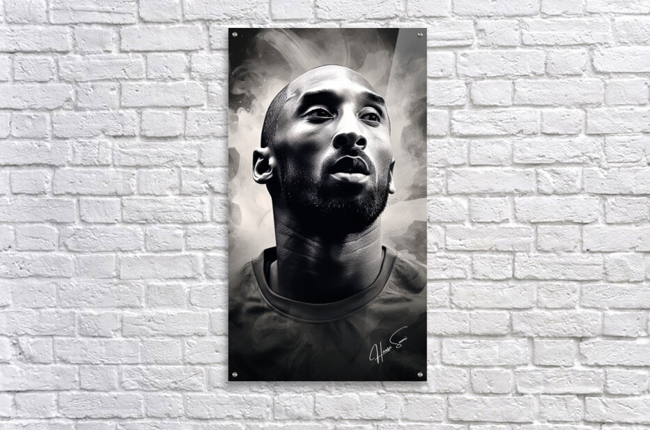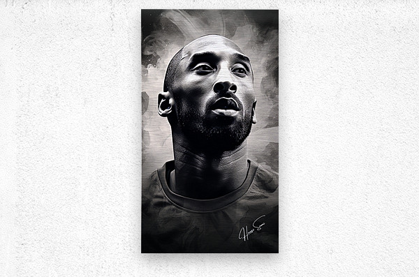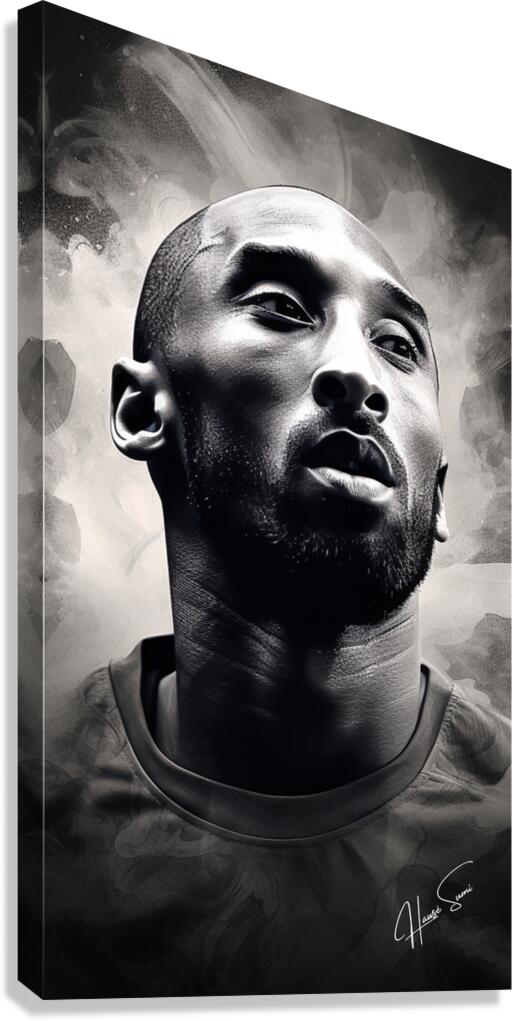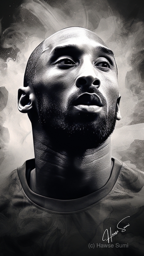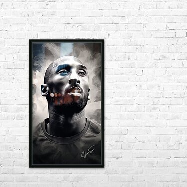 A grayscale watercolor painting highlighting Kobe Bryant's intense focus and the determination that defined his career. The abstract background em...[+]