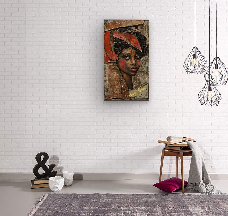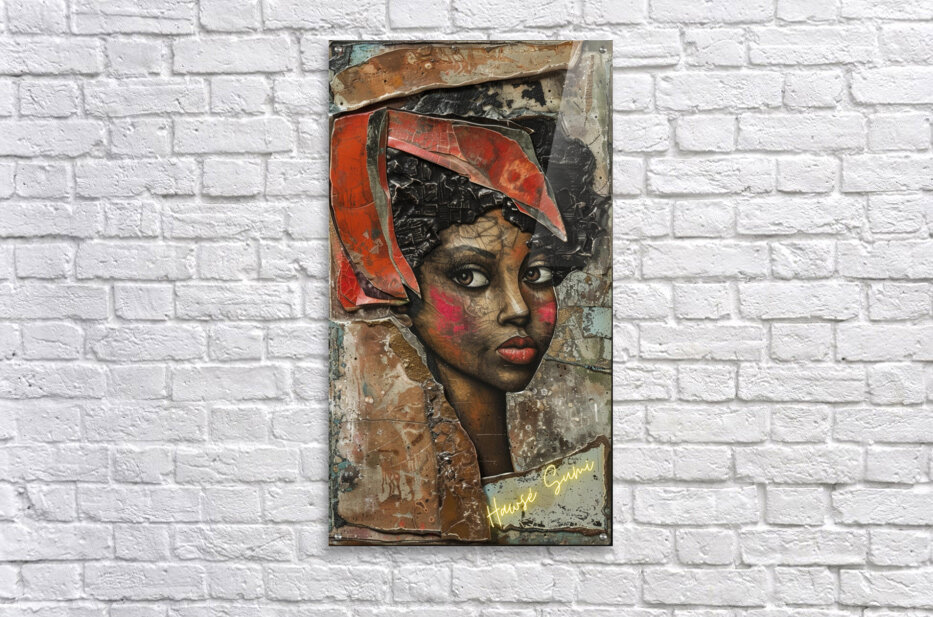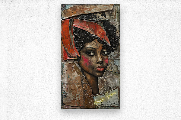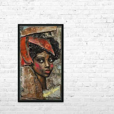 Zola’s piercing eyes and striking features are captured in a moment of profound thought. Her headwrap, a vibrant red, contrasts sharply against the textured backdrop, symbolizing the intensity of her spirit and the depth of her experiences. The raw, earthy tones of the artwork highlight her strength and resilience.
