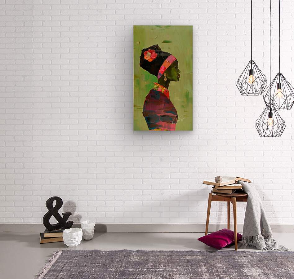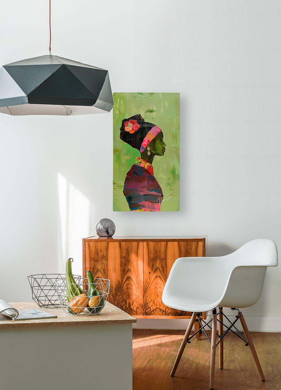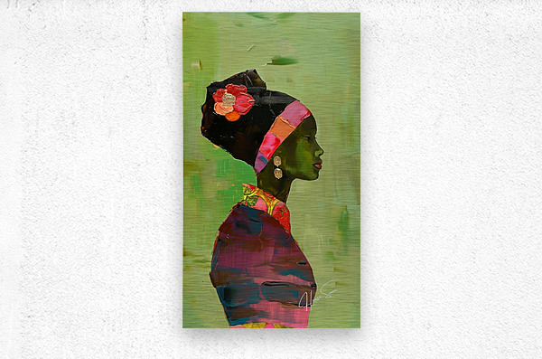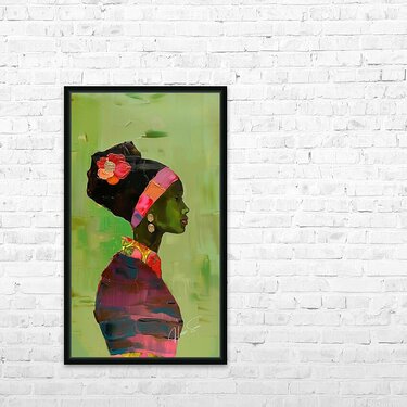 Amidst a lush, green landscape, a serene figure exudes an aura of calm and tranquility. Her delicate headwrap, adorned with a single red flower, symbo...[+]