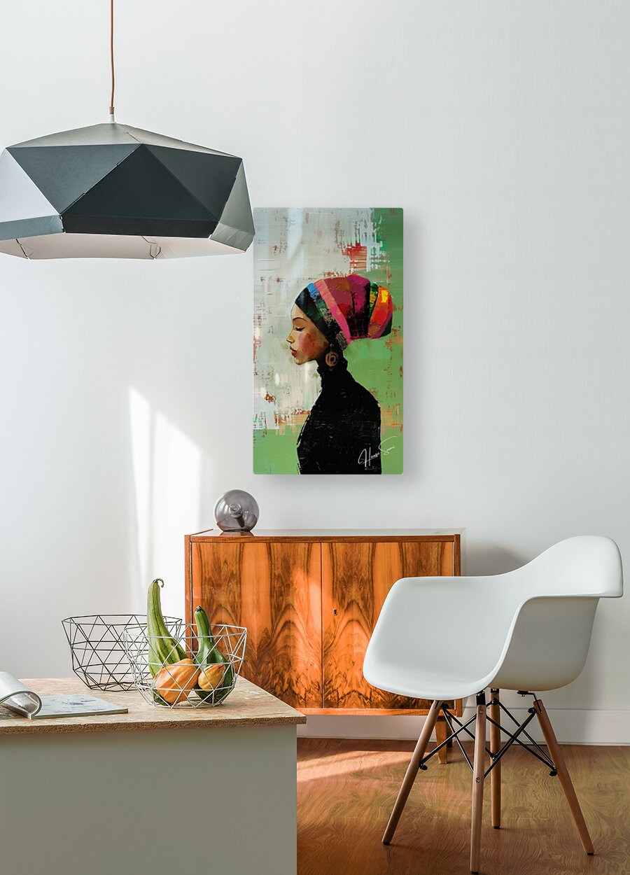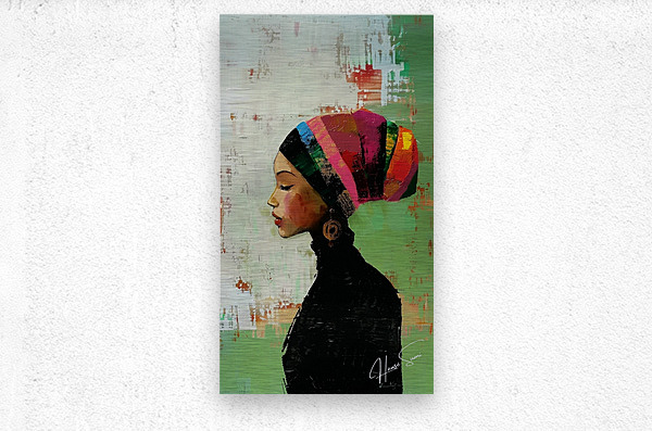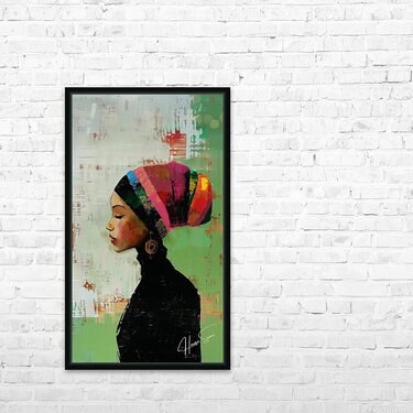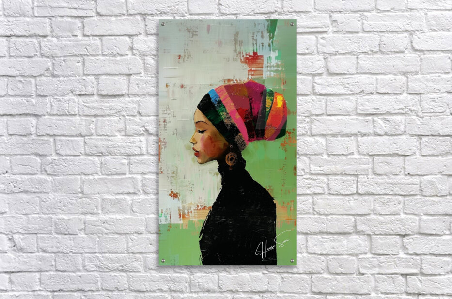 Set against a soft, abstract background, a woman adorned in a multi-colored headscarf stands in profile. Her quiet confidence and poised demeanor speak volumes about her strength and heritage. This piece is a celebration of the vibrant legacy passed down through generations, honoring the blend of modernity and tradition that defines her identity.