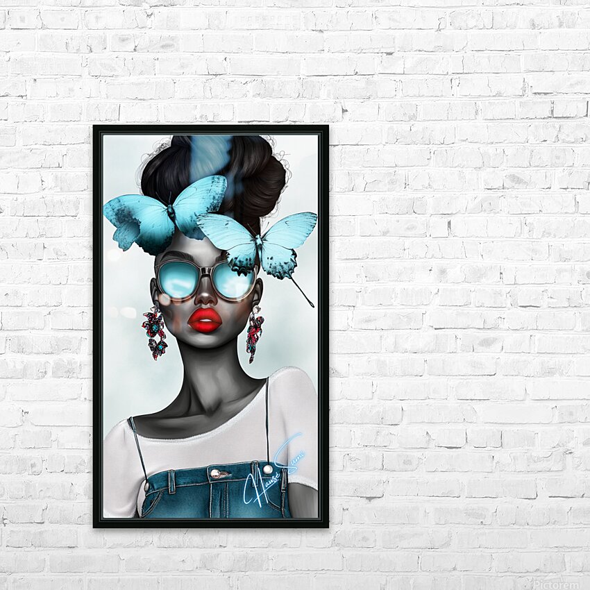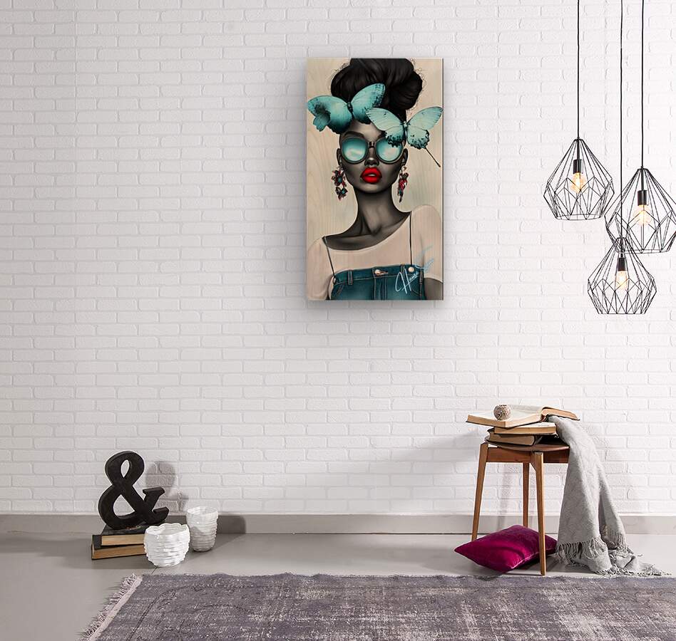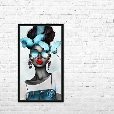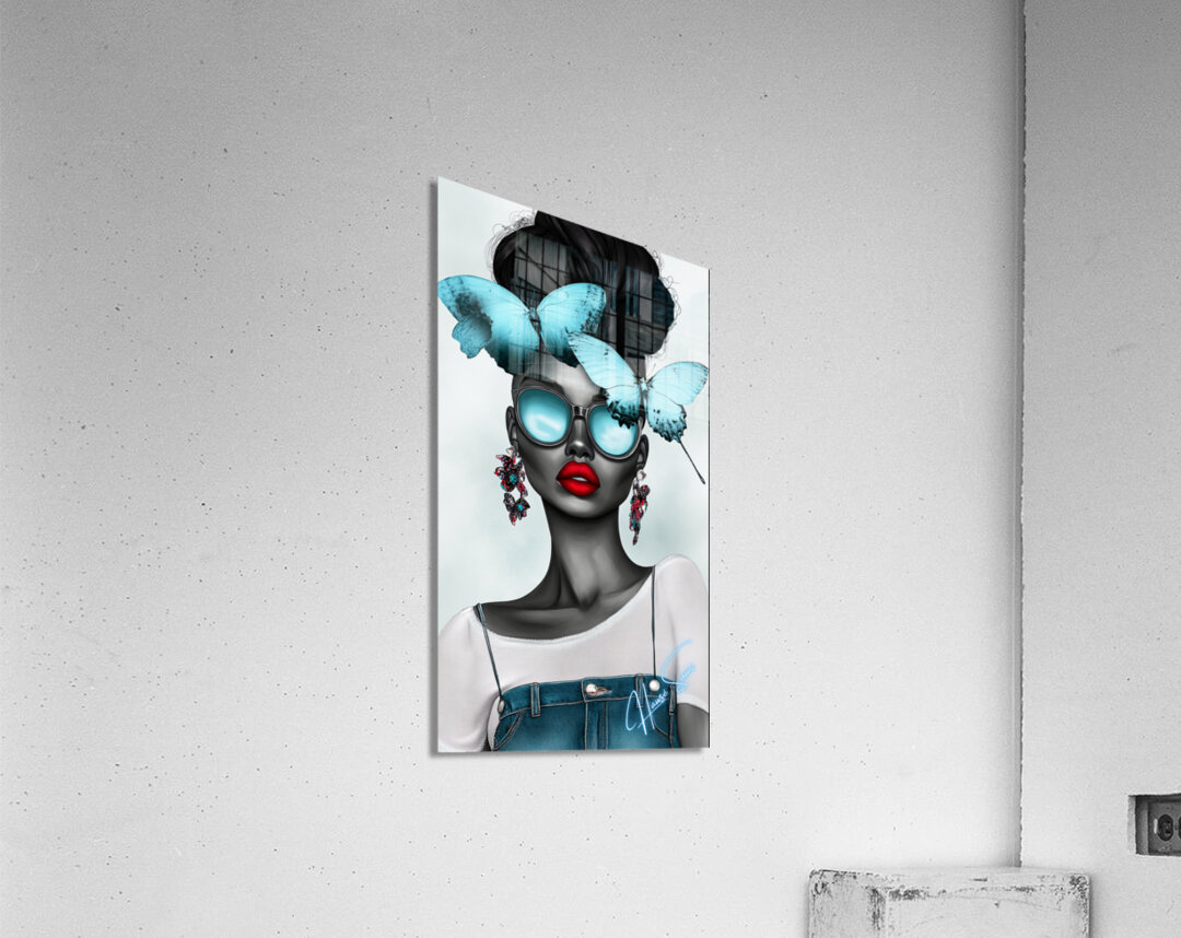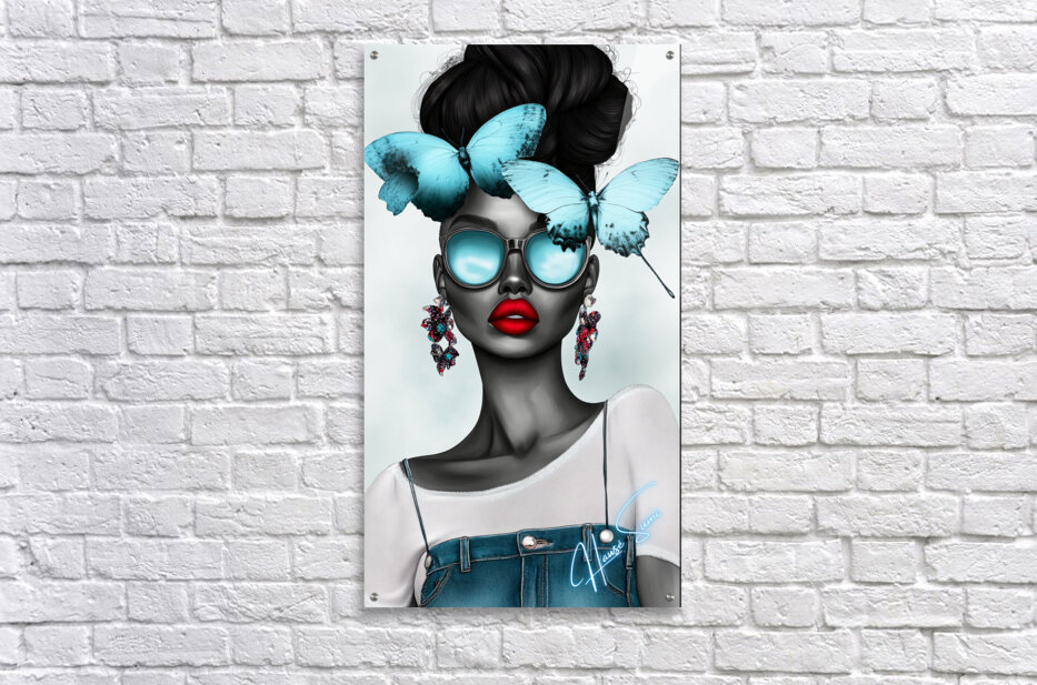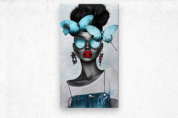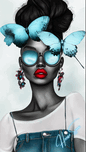 Wearing oversized aqua sunglasses and adorned with sky-blue butterflies, she embodies calm confidence and a mysterious allure. Her red lips pop against her monochromatic skin, contrasting with the delicate butterflies resting on her crown—a symbol of her inner serenity balancing her fierce, outgoing nature.